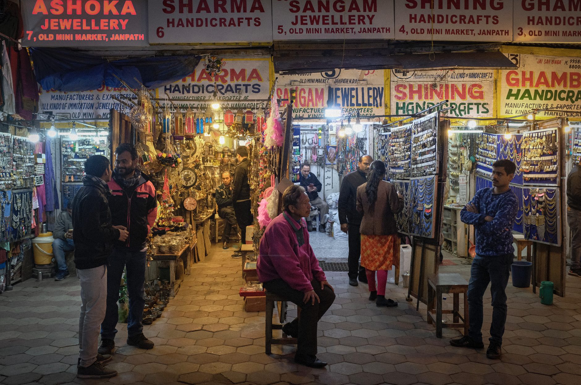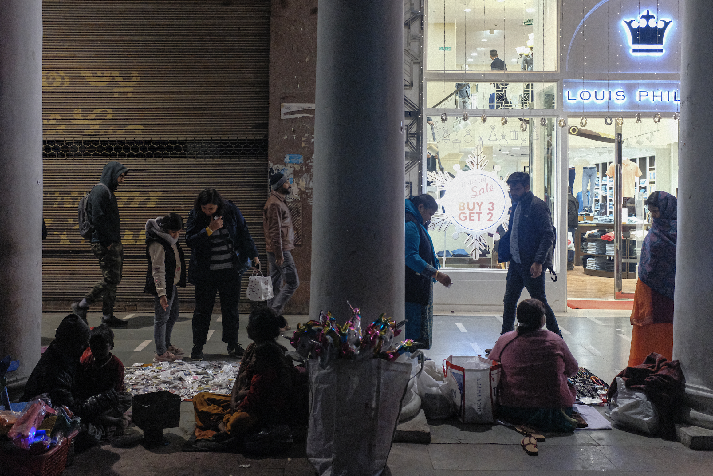 카메라를 들고 뉴델리 코넛플레이스로 걸었다. 혼잡하고 복잡한 공간 속에서 사람들은 서로를 스치며 지나거나 멈춰섰다.