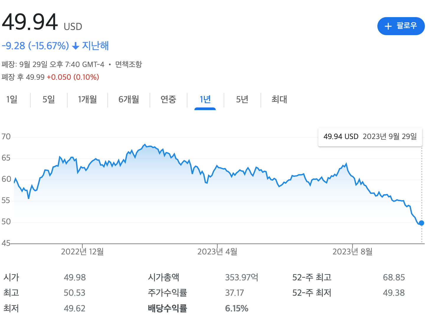 그럼에도 주가가 하락하는 것은 안타까운 일이다. 연 6%에 달하는 리얼티 인컴 배당 수익률은 매력적이지만 금리 인상으로 인한 배당주 매력 감소와 더불어 상업용 부동산 침체로 인해 리얼티 인컴의 주가는 계속 하락하고 있다.