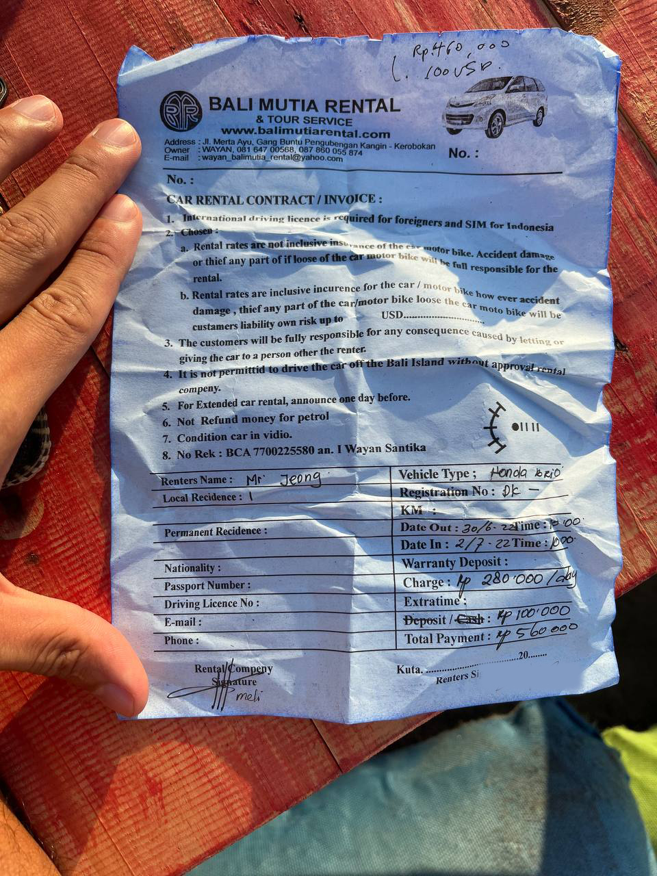 현장에서 다음과 같이 약식 인보이스를 쓰고 10만 루피아를 보증금으로 냈고, 나머지 잔금인 46만 루피아는 차량을 받을 때 치르기로 했다. 추가적으로 차량을 받으며 100달러의 보증금을 함께 내야 한다고 했다. 보증금은 차량 반환 시 문제가 없다면 돌려준다고 했다.