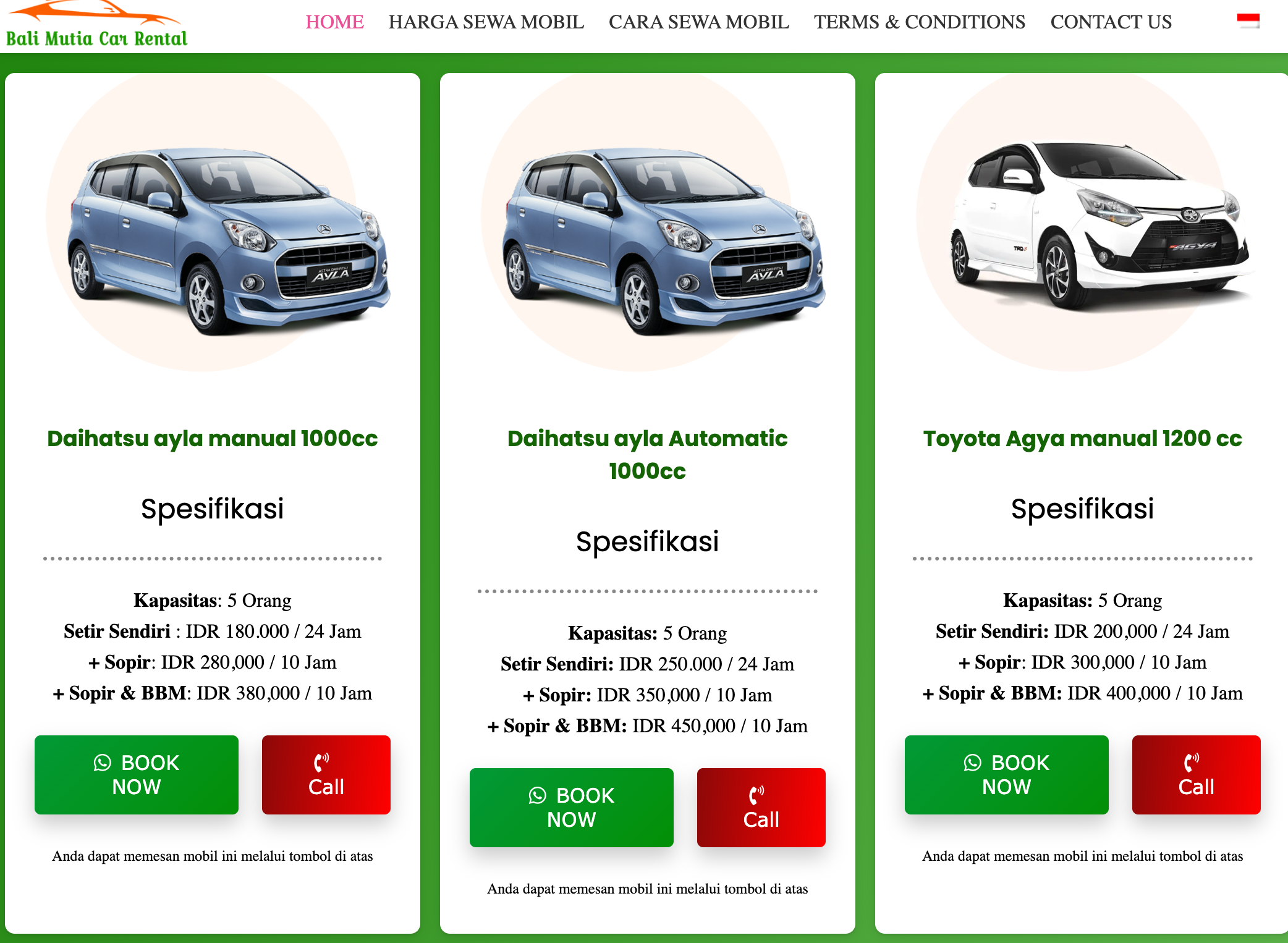발리에서 차량을 렌트하는 방법은 한국과 크게 다르지 않다. 홈페이지에서 원하는 차종과 가격을 보고 날짜와 함께 와츠앱으로 문의하거나 직접 방문하면 된다. 다만, 홈페이지에 명시된 가격을 잘 봐두는 게 좋은데 때로는 외국인이라는 이유로 더 높은 가격을 부르기도 하기 때문이다. 그러니 애초부터 문의하며 해당 사진을 함께 보여주는 게 좋은 방법이다.