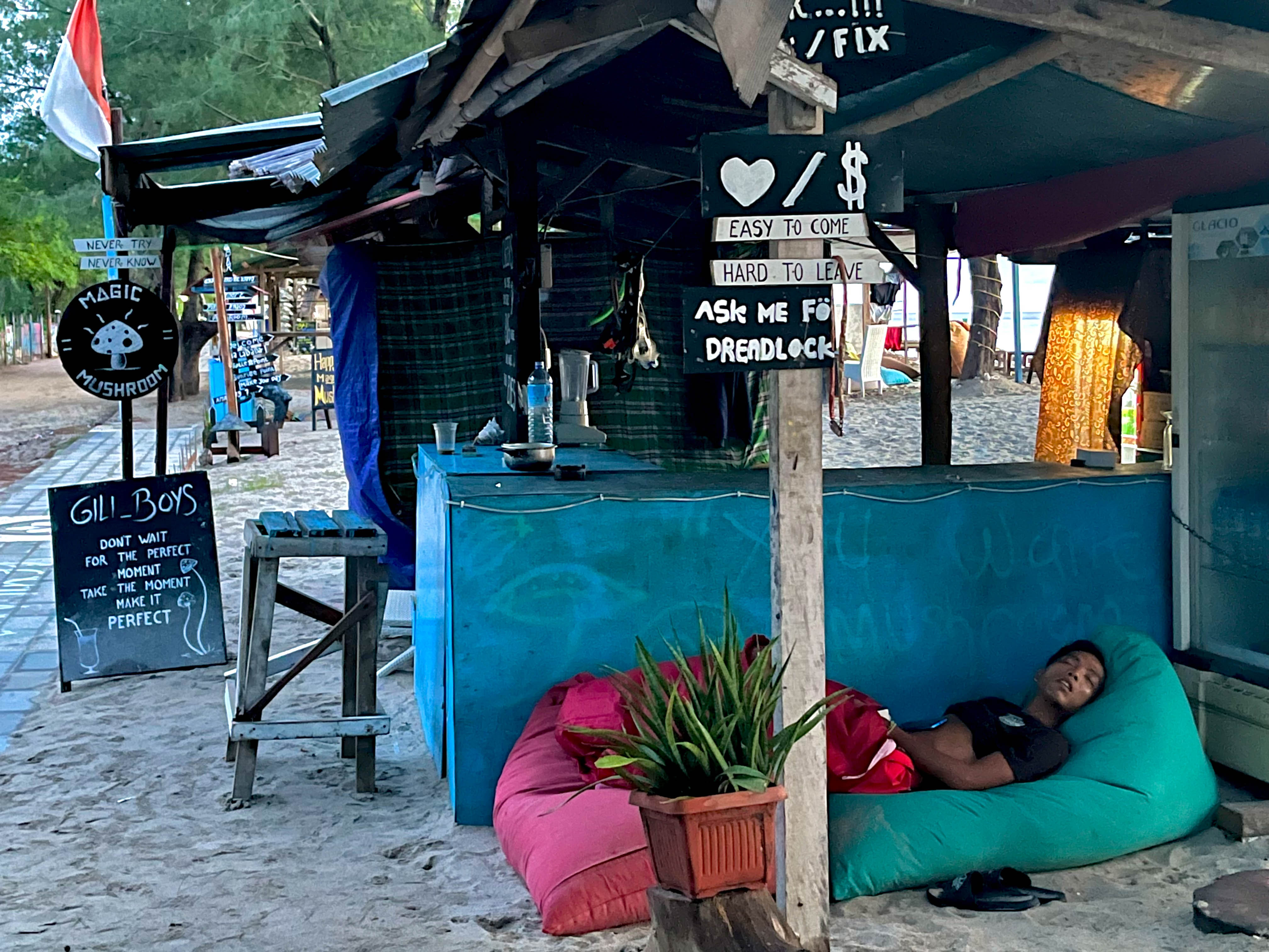 돌아오는 길에 사진을 몇 장 찍었다. 간판에 적힌 문구와 그 아래서 깊은 꿈을 꾸며 잠을 자는 현지인의 모습이 인상적이었다.