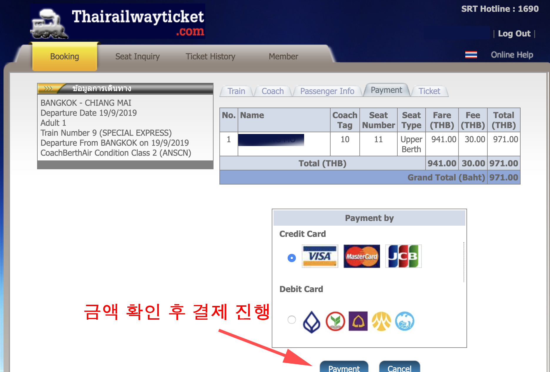 좌석을 선택하면 온라인 구매 수수료 30바트를 포함한 가격이 표시됩니다. 이후 해외 결제가 가능한 카드를 통해 결제를 진행합니다. 티켓은 이메일로 전송되며, 전송된 티켓은 꼭 프린트 해 가셔야 합니다.