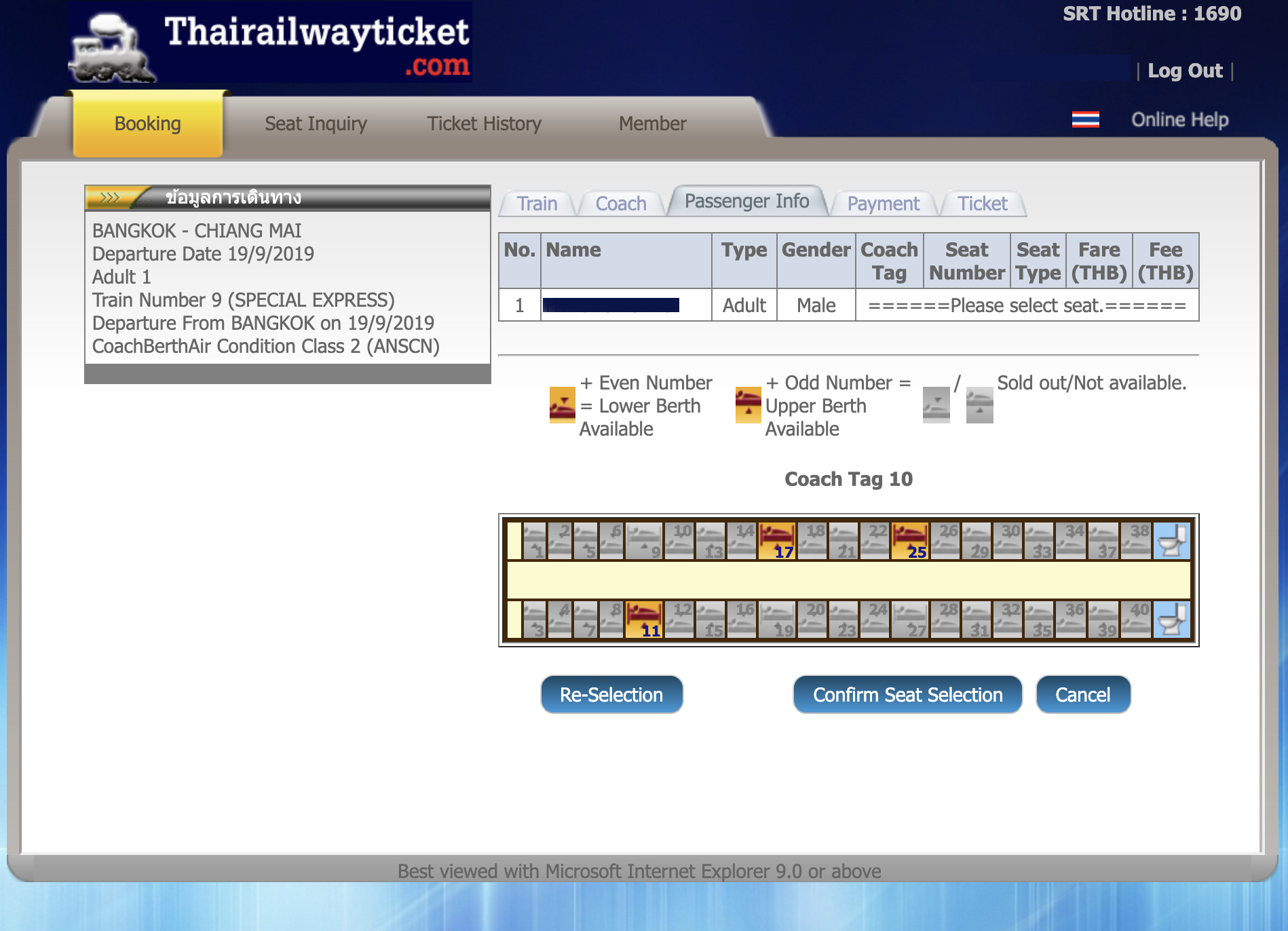 설정 후 검색 버튼을 누르시먼 예매 가능한 기차(초록)와 그렇지 않은 기차(회색)가 표시됩니다. 보통 치앙마이로 갈 떄는 야간 열차를 많이 선택하곤 하시는데요. 야간 열차의 경우 좌석이 1등석과 2등석으로 나뉩니다. 1등석의 경우 1,653바트/1,453바트이며, 2등석의 경우 1,042바트/941바트입니다. 저는 출발 하루 전에 예매 했는데 여유를 두고 일찍 예매하면 조금 더 저렴하게 예매 할 수 있어 보였습니다. 같은 클래스의 경우에도 아래쪽 침대냐 위쪽 침대냐에 따라 가격이 다릅니다. 이후 여권 번호와 탑승객의 이름을 입력 후 Manual Seat Selection을 클릭해 침대를 선택합니다.