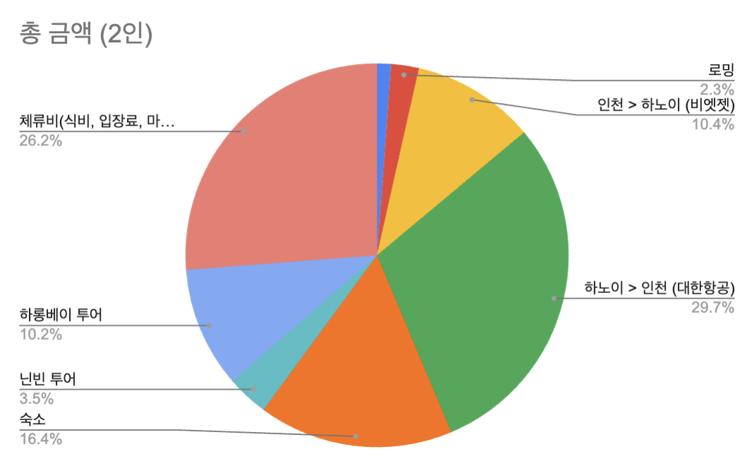 베트남 하노이를 2명이서 4박 5일 동안 지출한 총 금액은 250만원 가량이다. 딱히 낭비되었다고 생각하는 비용은 없지만, 항공료가 차지하는 부분이 꽤 크다. 왕복으로 저가 항공을 이용한다면 1인당 100만원, 2인 기준 200만원 정도 선에서 무난히 여행을 할 수 있지 않을까 한다. 항목별 지출 비중을 정리해보면 다음과 같다.