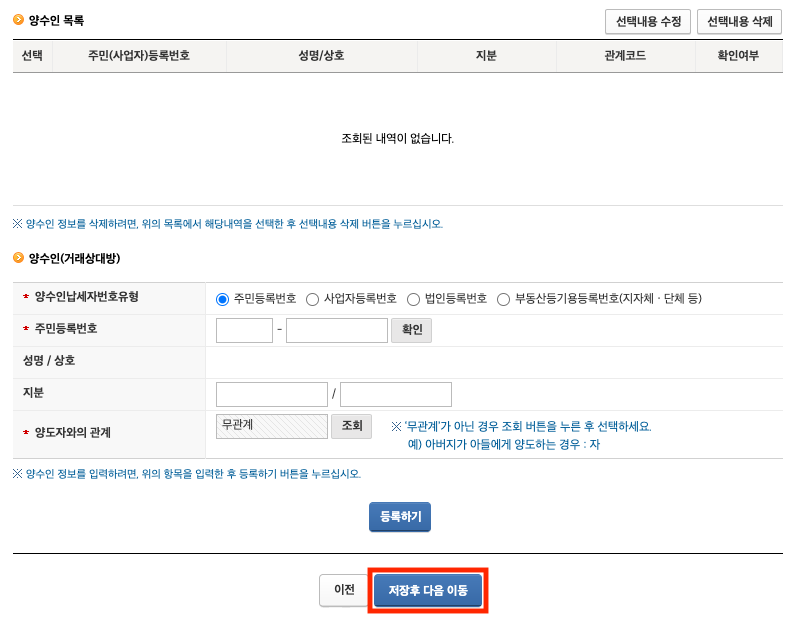 - 양수인을 정확하게 알 수 없는 경우에는 입력하지 않아도 됩니다.
