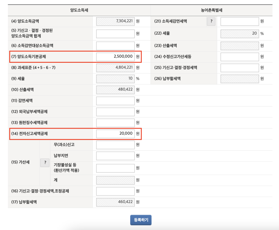 최종적으로 납부해야 할 양도소득세가 표시됩니다. 이 때, 중요한 것은 양도소득기본공제 250만원 혜택을 받는 것입니다. 또한, 온라인 신고 시 반기에 한 번씩 전자신고세액공제 2만원을 받을 수 있으므로 이것도 잊지 말고 입력해주세요.