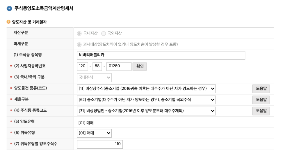 - 양도 및 취득 유형은 매매이고, 마지막으로 양도주식 수 110을 입력해줍니다.