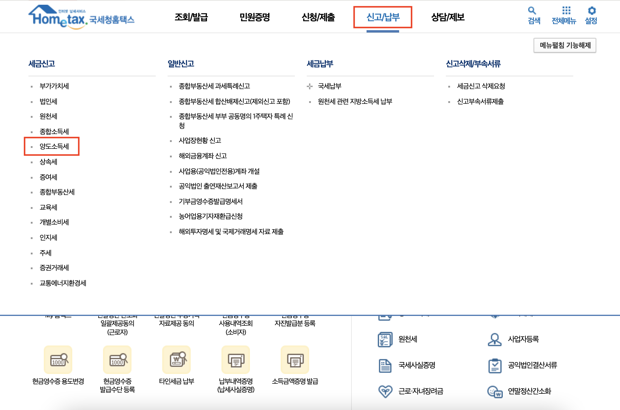 2. 양도소득 신고 화면 이동