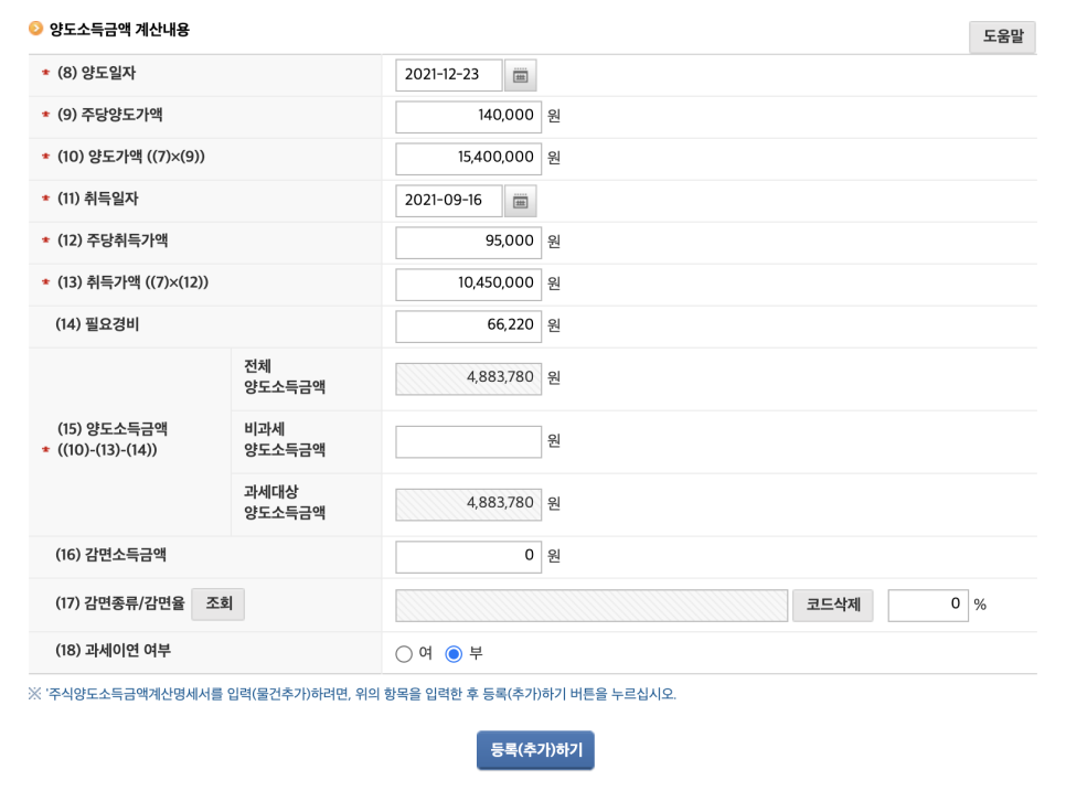 다음으로 양도 소득세를 납부하기 위한 금액을 계산할 차례입니다. 주당 양도 가격 및 취득 가격을 입력하면, 아래와 같이 양도가액 및 취득가액이 표시됩니다. 필요 경비의 경우에는 매수 및 매도 수수료와 비상장주식 증권거래세율인 0.35%를 더한 다음 입력해주시면 됩니다.
