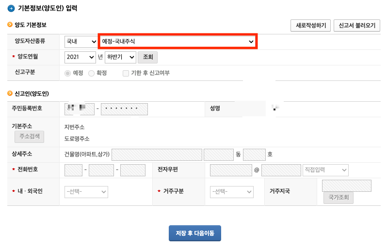 - 양도자산종류: 국내 - 예정 (국내주식)