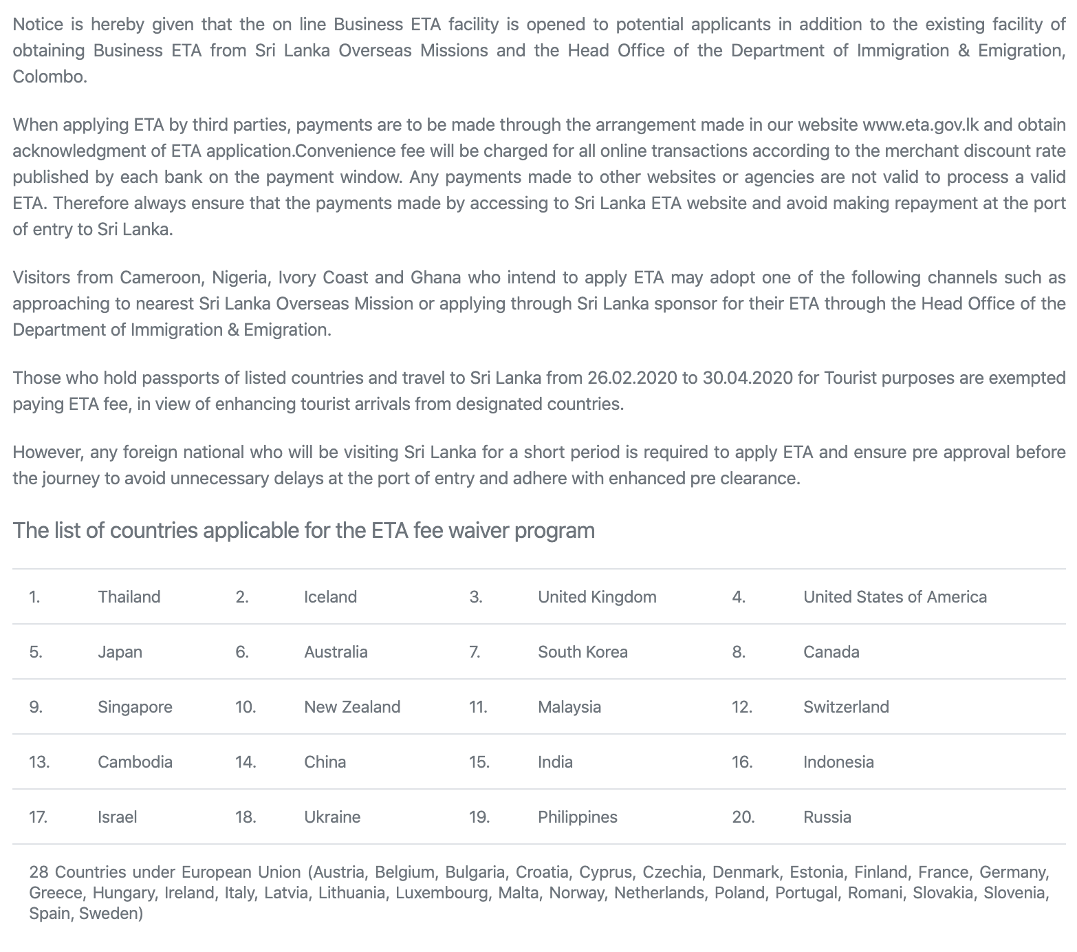 ※ 2020년 4월 30일까지 다음 국가의 여권을 소지(한국 포함)한 국가에 한시적으로 비자 신청 요금을 면제해 주고 있습니다. 다만, 무비자로 입국할 수 있는 것은 아니니 비자 관련 사항(도착 비자, 비즈니스 비자, 관광 비자, 전자 비자 등)들을 꼼꼼히 확인하는 게 중요합니다.