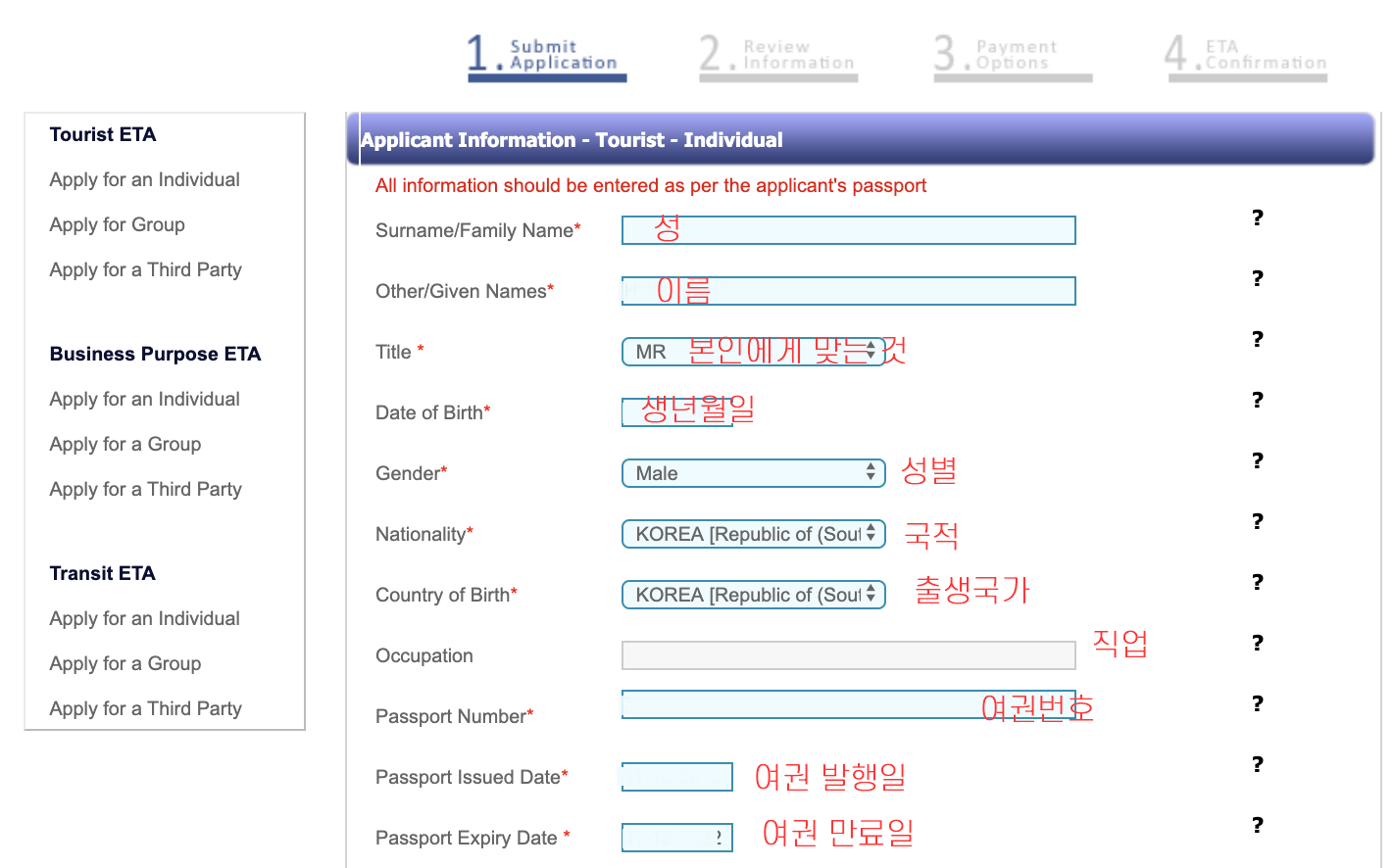 4. 영문으로 비자 및 신청자 관련 사항을 작성합니다. 특별히 주소의 경우에는 현재 머물고 있는 곳의 주소를 적으면 됩니다.