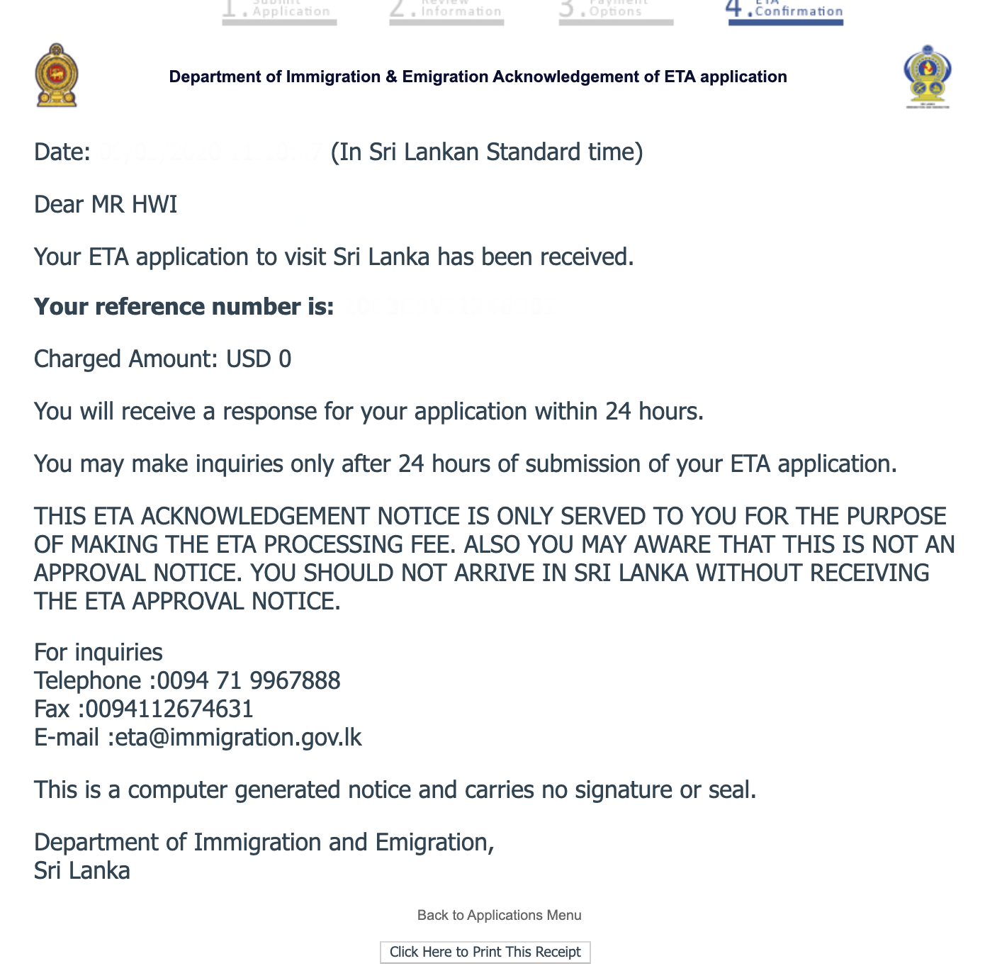 6. 이후 최종 확인 화면에 도착하게 된다면 다 된 것입니다. 비자 결과는 24시간 이내에 통보되며, 추후 확인을 위해 비자 신청 완료 후 안내되는 참조 번호(reference number)를 메모해 둡니다.