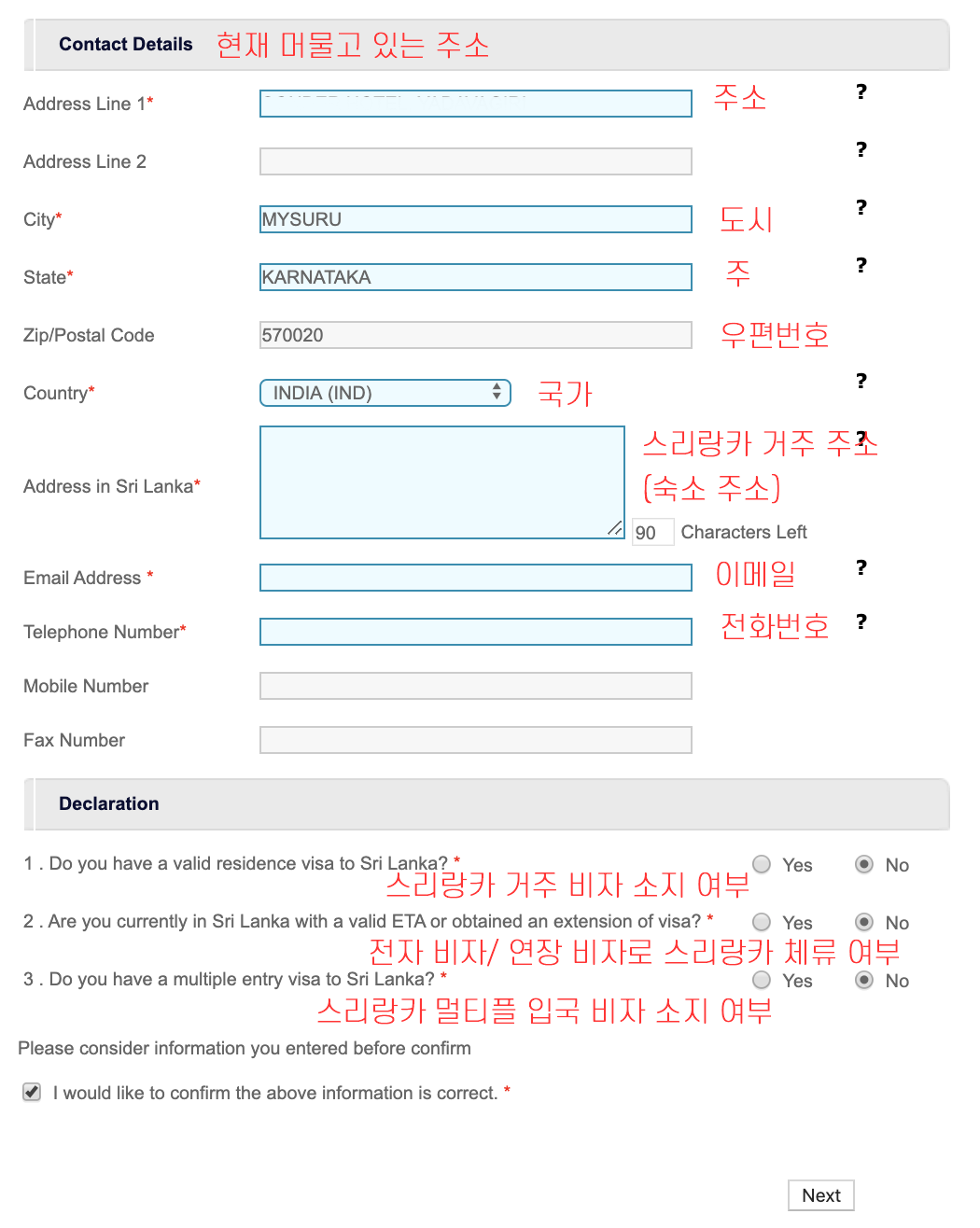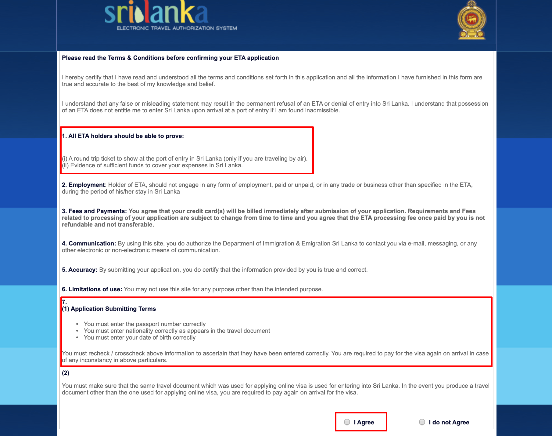 2. 관련 안내문을 읽고 동의를 선택합니다. 스리랑카 입국시 왕복 항공권을 소지해야 하며, 충분한 여행 경비를 소지하고 있어야 합니다. 또한 여행자 정보를 여권과 동일하게 입력해야 한다고 안내되고 있습니다.