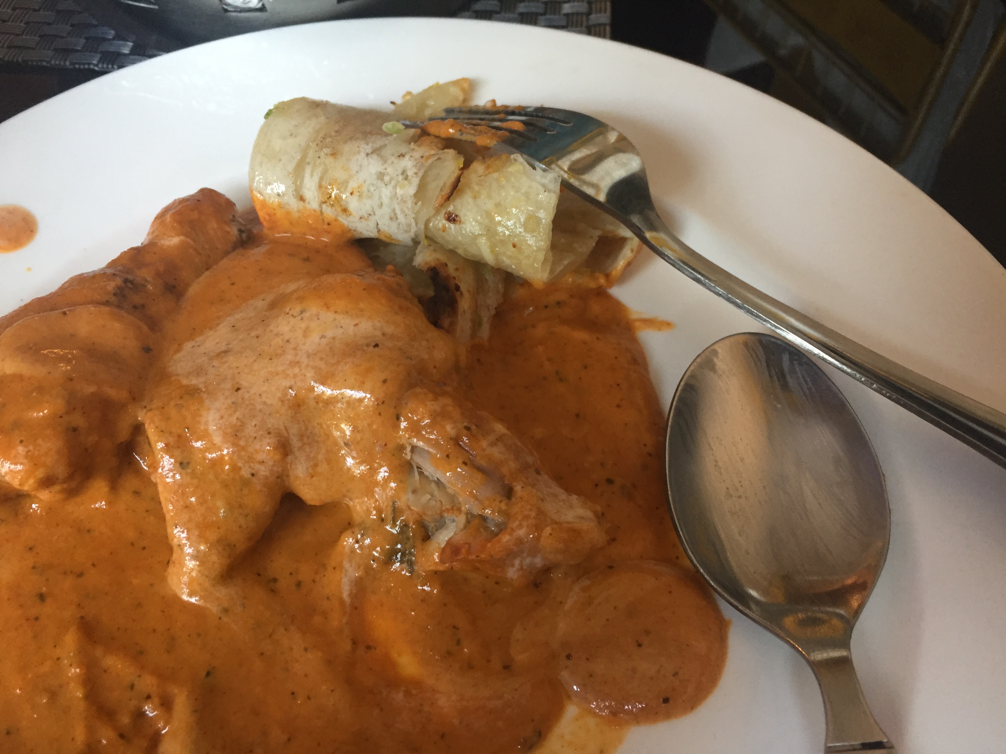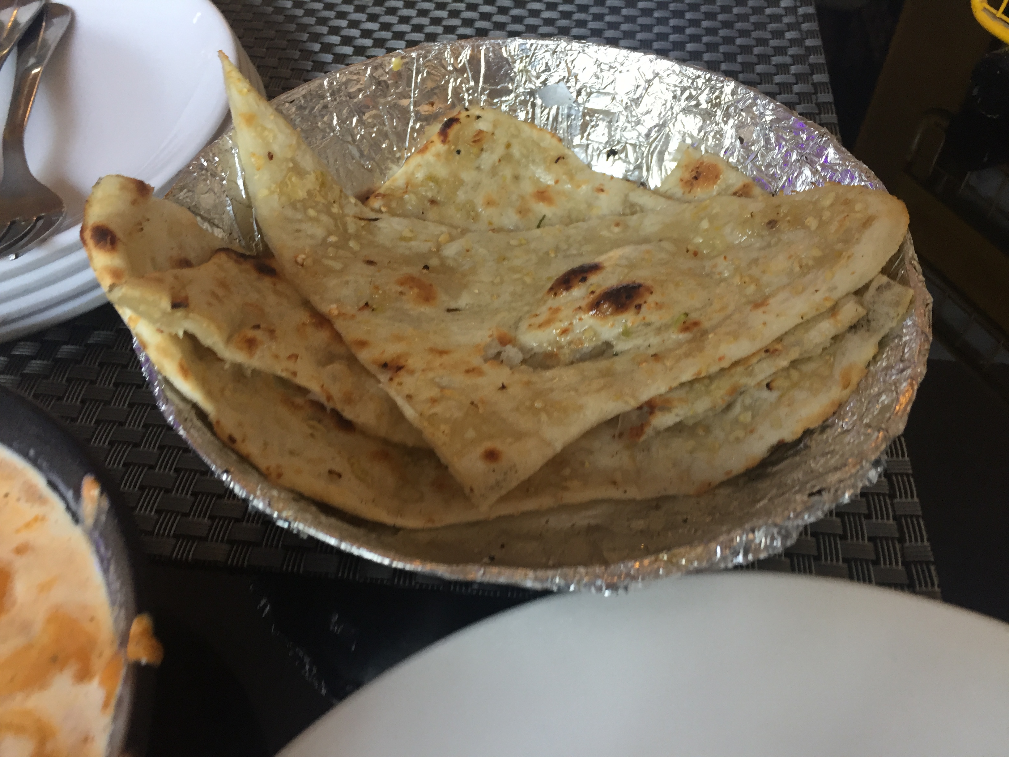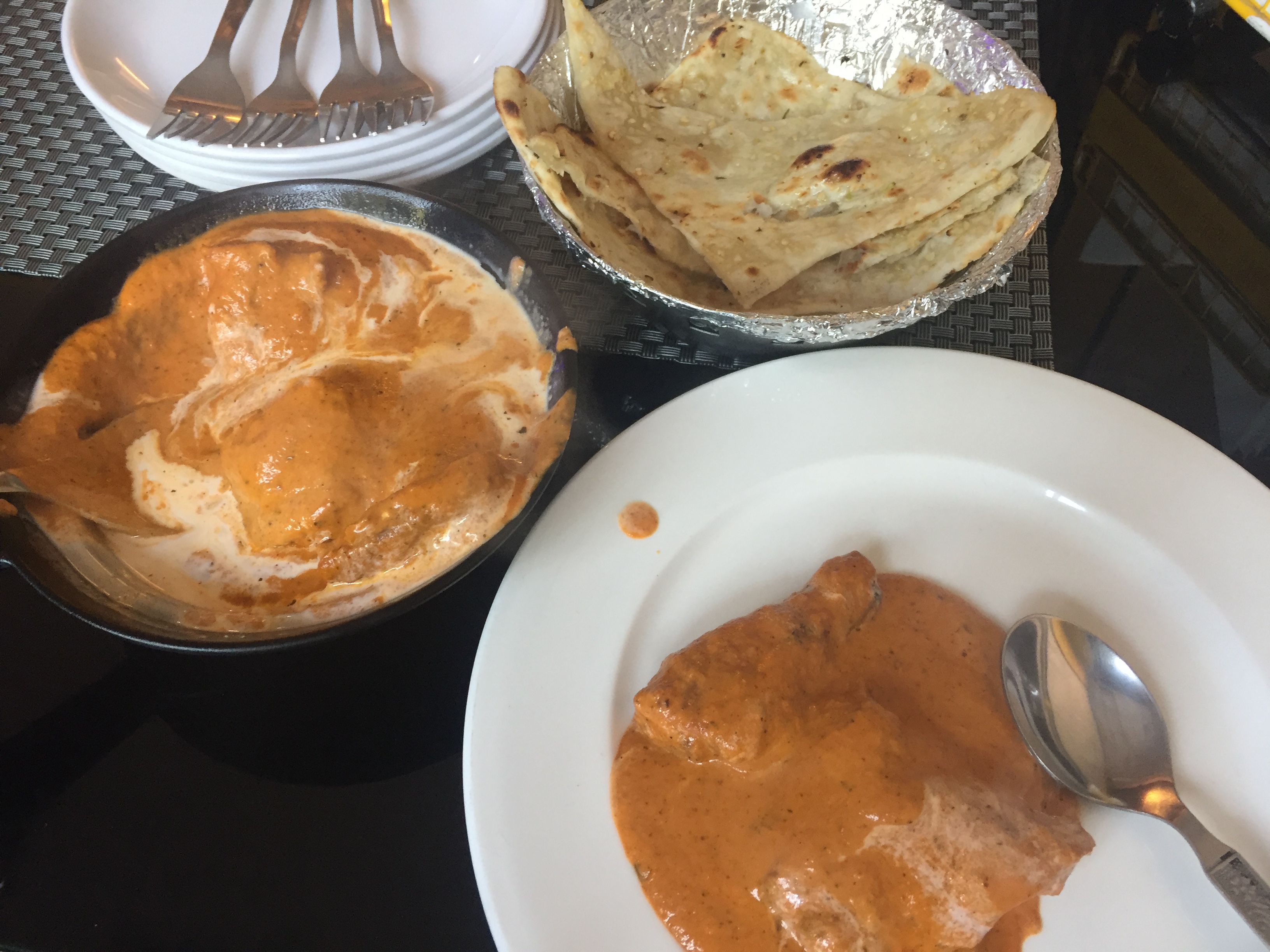 매니저가 오더니 베지(veg)와 논베지(non-veg) 중에 어떤 걸 먹을건지 물었고, 고기를 먹기 위해 논베지라고 말했습니다. 그랬더니 버터 치킨과 난을 추천해줘서 그렇게 먹기로 했습니다. 어딘가 부족할 거 같아서 더 시켜야 하지 않느냐 물었더니 두 개면 충분할 거라 말해주더군요.