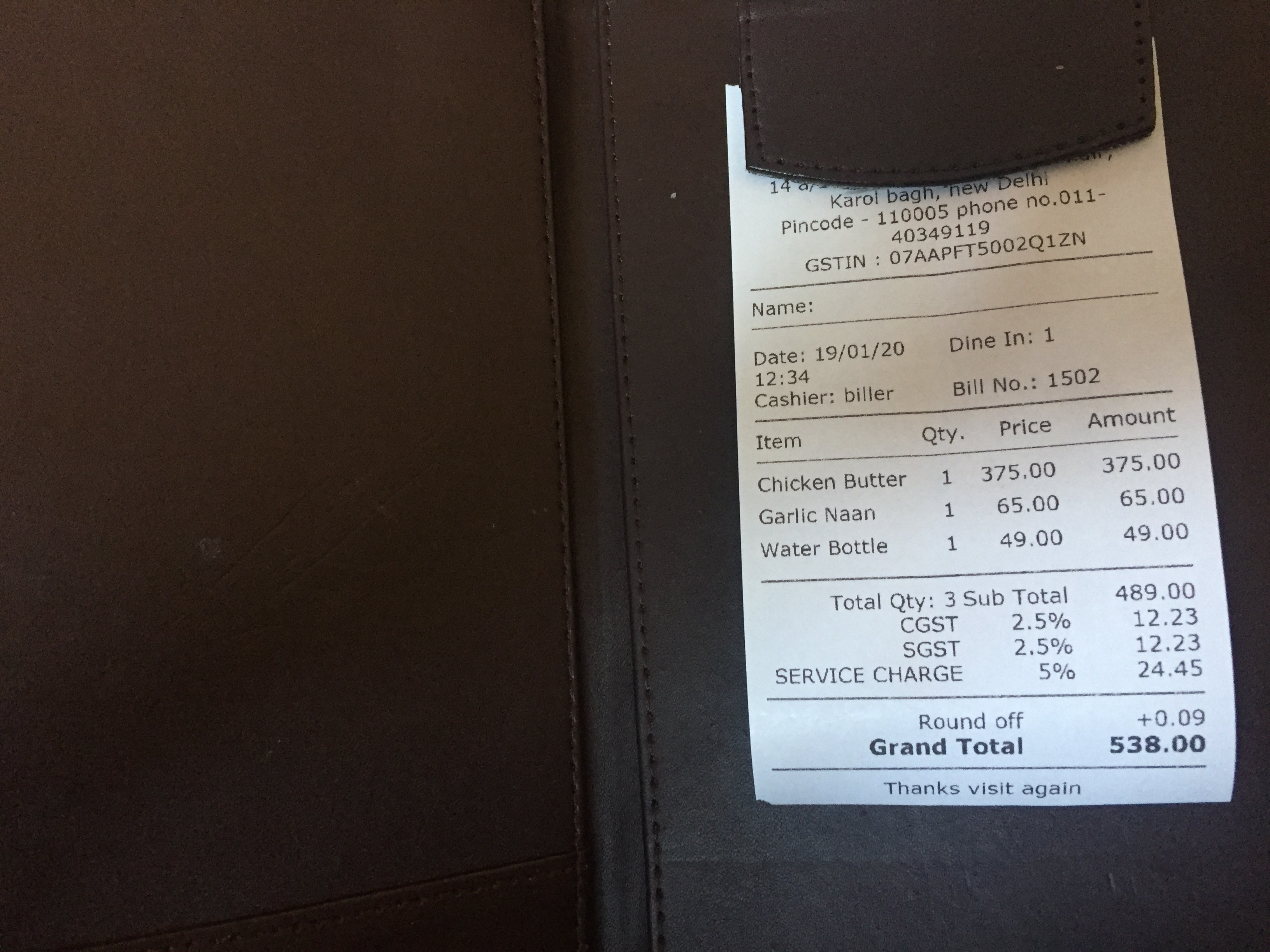 배부르게 한 끼 먹고 나니 서비스 차지까지 해서 총 가격은 538루피(=약 9000원)가 나왔습니다.