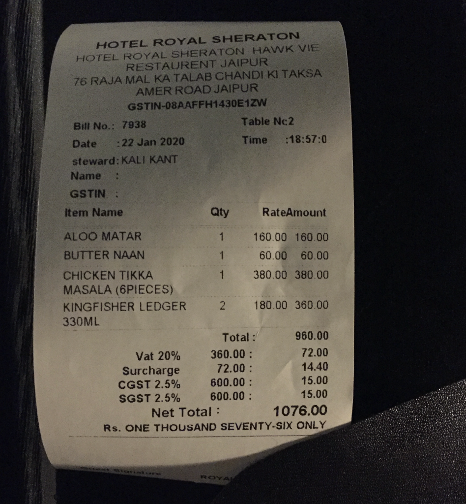 맥주는 두 잔을 마셨습니다. 최종적으로 1076루피(약18000원)을 지불했습니다. 인도에서 먹은 거 치고는 꽤 비싼 축에 속하지만 맥주 가격을 감안하면 음식 가격은 합리적인 수준인 거 같습니다.