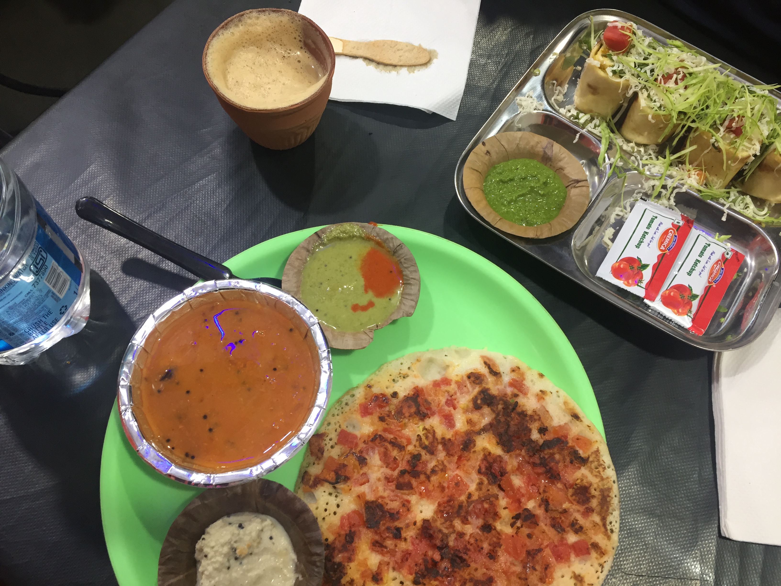 저는 토마토 우타팜을 시켰는데요. 인도 답게 여러 소스가 함께 나왔습니다. 사실, 피자를 기대했는데 그보다는 반죽 위에 야채를 따로 얹은 느낌이었습니다. 같이 간 친구는 베지 롤을 시켜 먹었습니다.