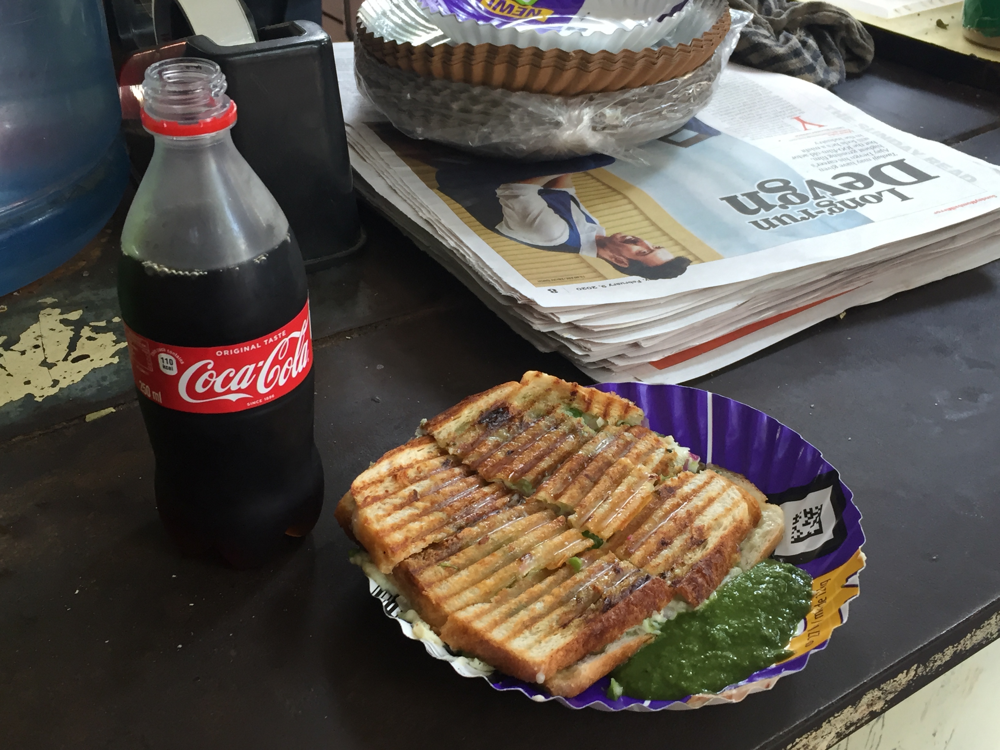 뭄바이에서 가장 인상 깊었던 음식이다. 매콤한 생양파와 피망을 전혀 익히지 않고 샌드위치에 넣는 게 인상적이었는데, 처음에는 매워서 이걸 어떻게 먹나 싶었는데 계속 먹다보니 나쁘지 않다는 생각이 들었다. 보통 아침은 이렇게 간단한 빵을 먹고, 쥬스를 한잔씩 마셨다. 콜라와 샌드위치 합쳐서 100루피. (약 1700원)