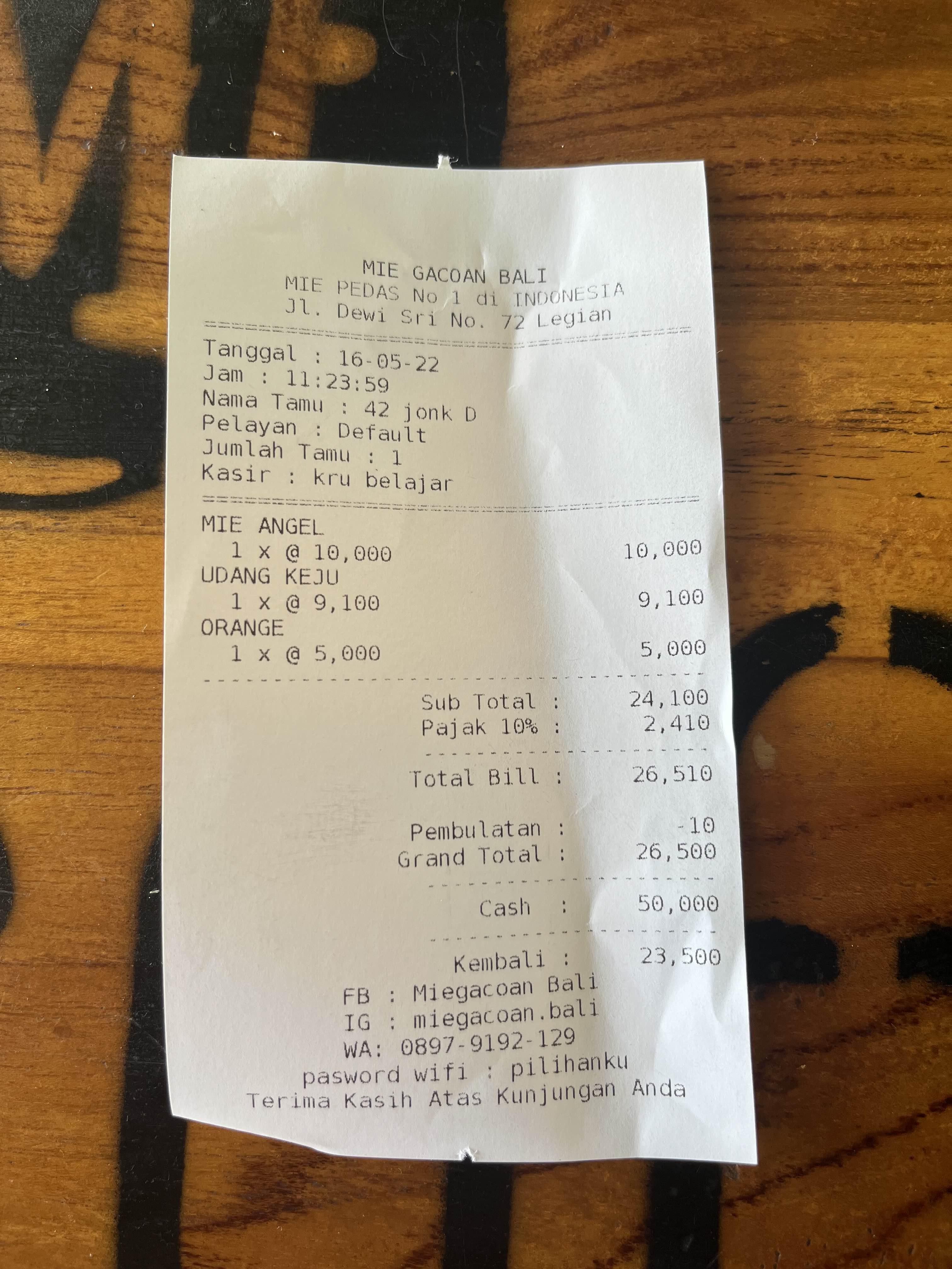 다 먹고 26,500 루피아가 나왔다. 우리나라 돈으로 따지면 3천원이 채 안되는 저렴한 현지 식당이다.