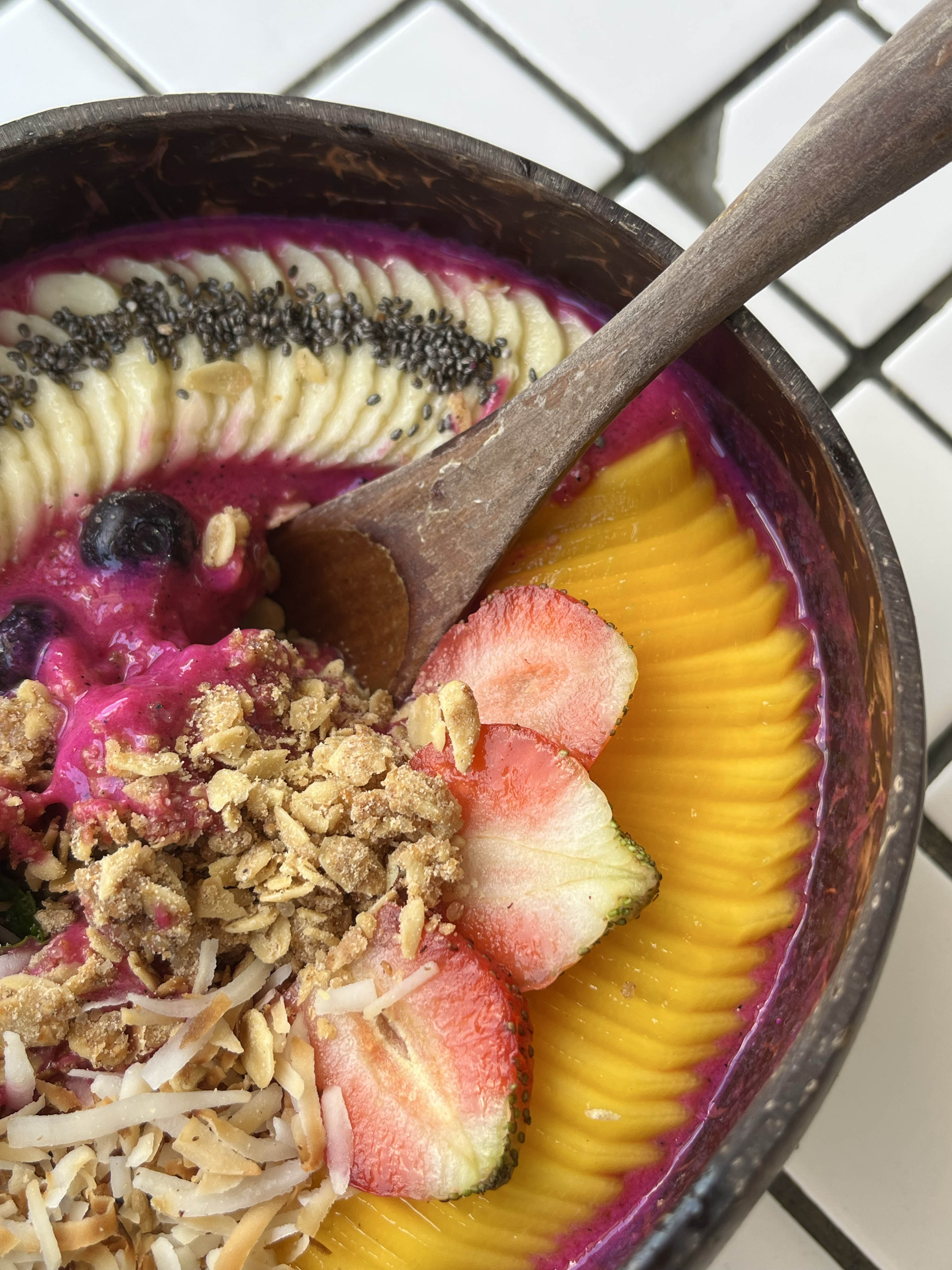 용과(dragon fruit), 파파야, 딸기, 사과, 코코넛 밀크를 넣은 Benasari라는 스무디볼을 시켜봤다. 가격이 95,000 루피아로 발리에서 웬만한 식사 한끼 보다 비싸긴 했지만 정말 맛있었다.