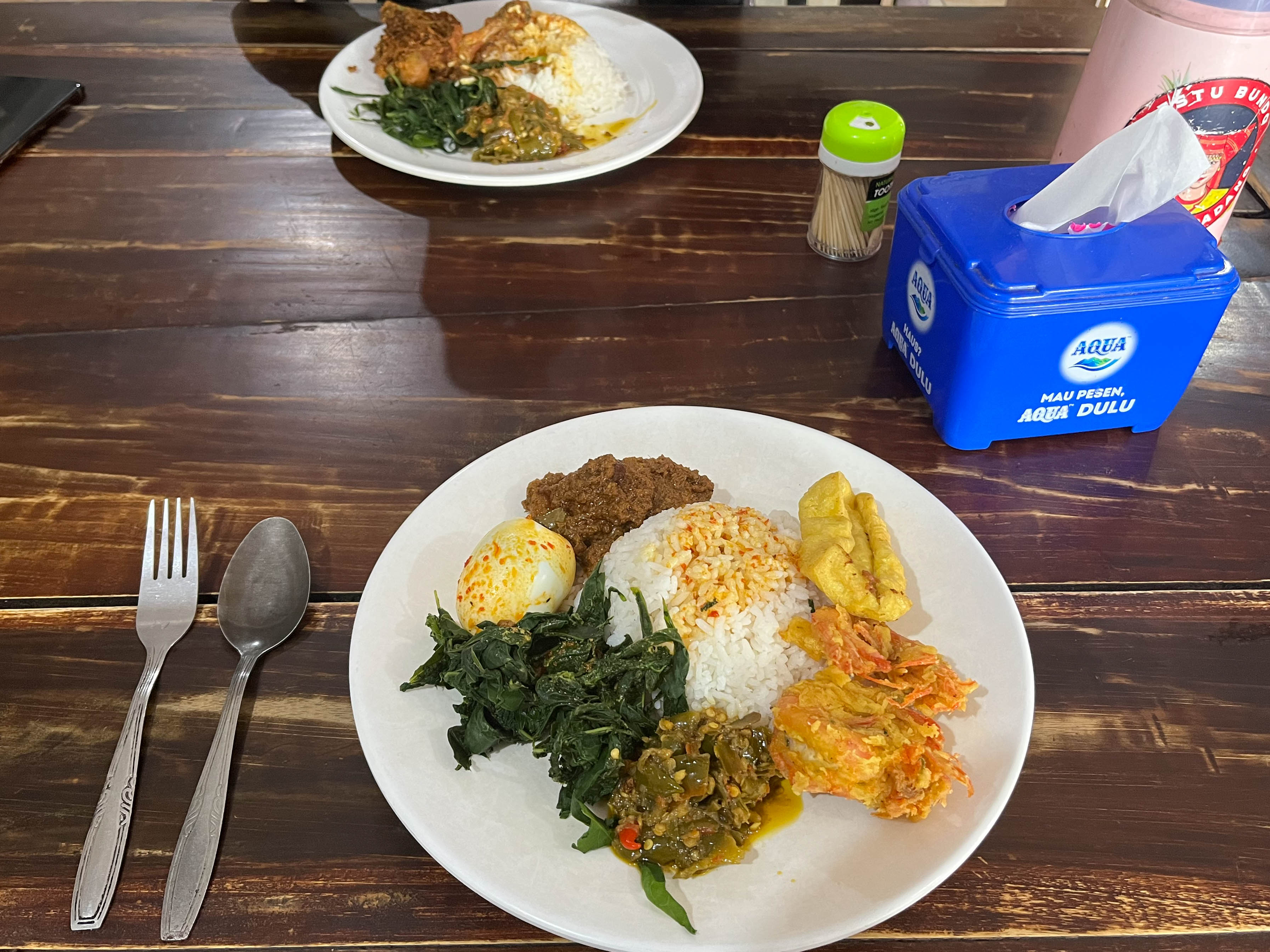점심은 이름은 잘 기억나지 않은 현지 와룽(작은 음식점)에서 나시 참푸르로 먹었다. 나시 참푸르(Nasi Campur)는 동남아 지역에서 먹는 음식으로 나시는 '밥', 참푸르는 '섞인' 것을 의미한다. 한국으로 따지면 비빔밥과 비슷한데 따로 비벼먹지는 않고 반찬을 한 접시에 담아 먹는 간단한 현지식 뷔페라 할 수 있다. 가격은 보통 2~5천원 사이다.