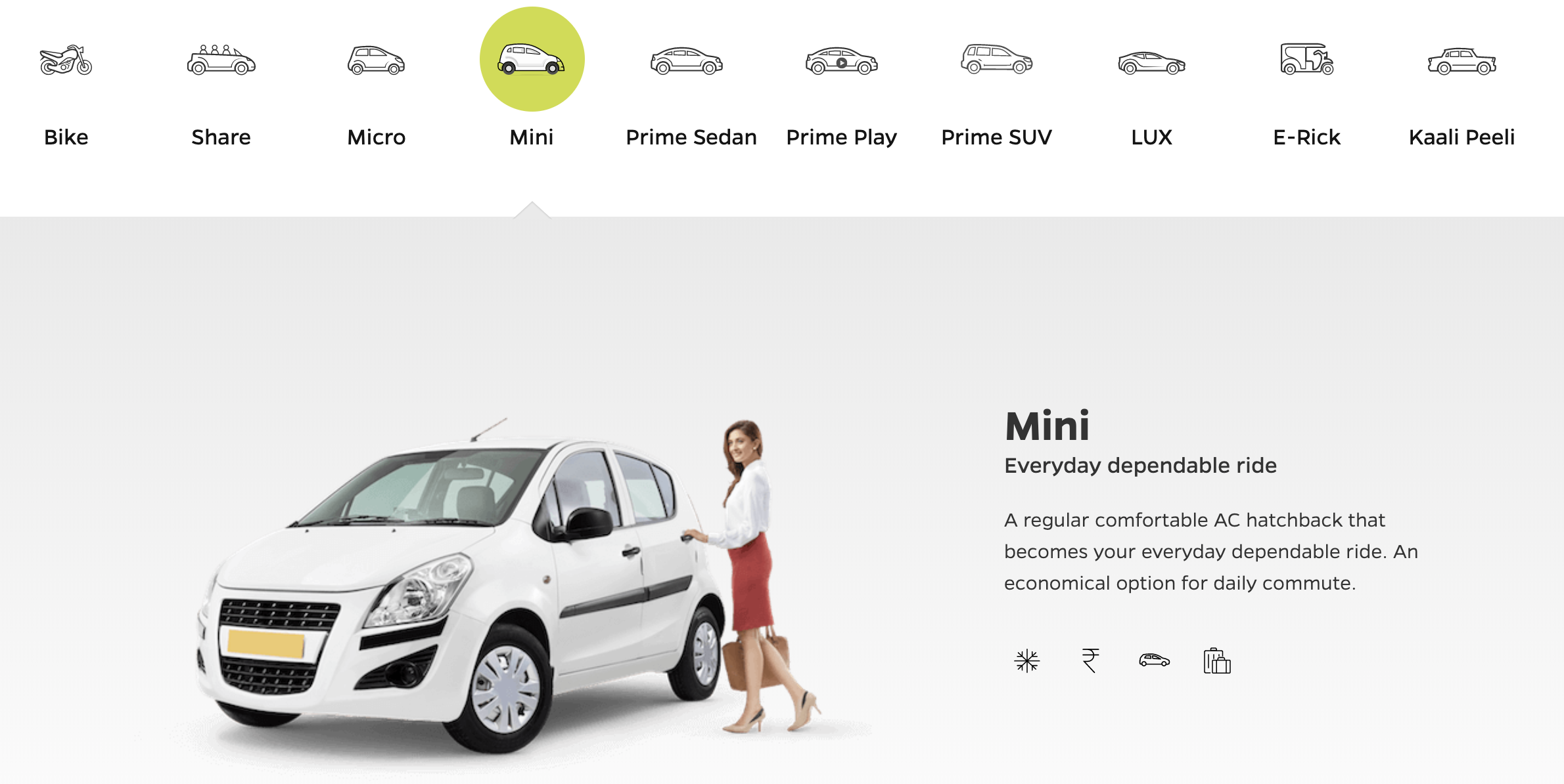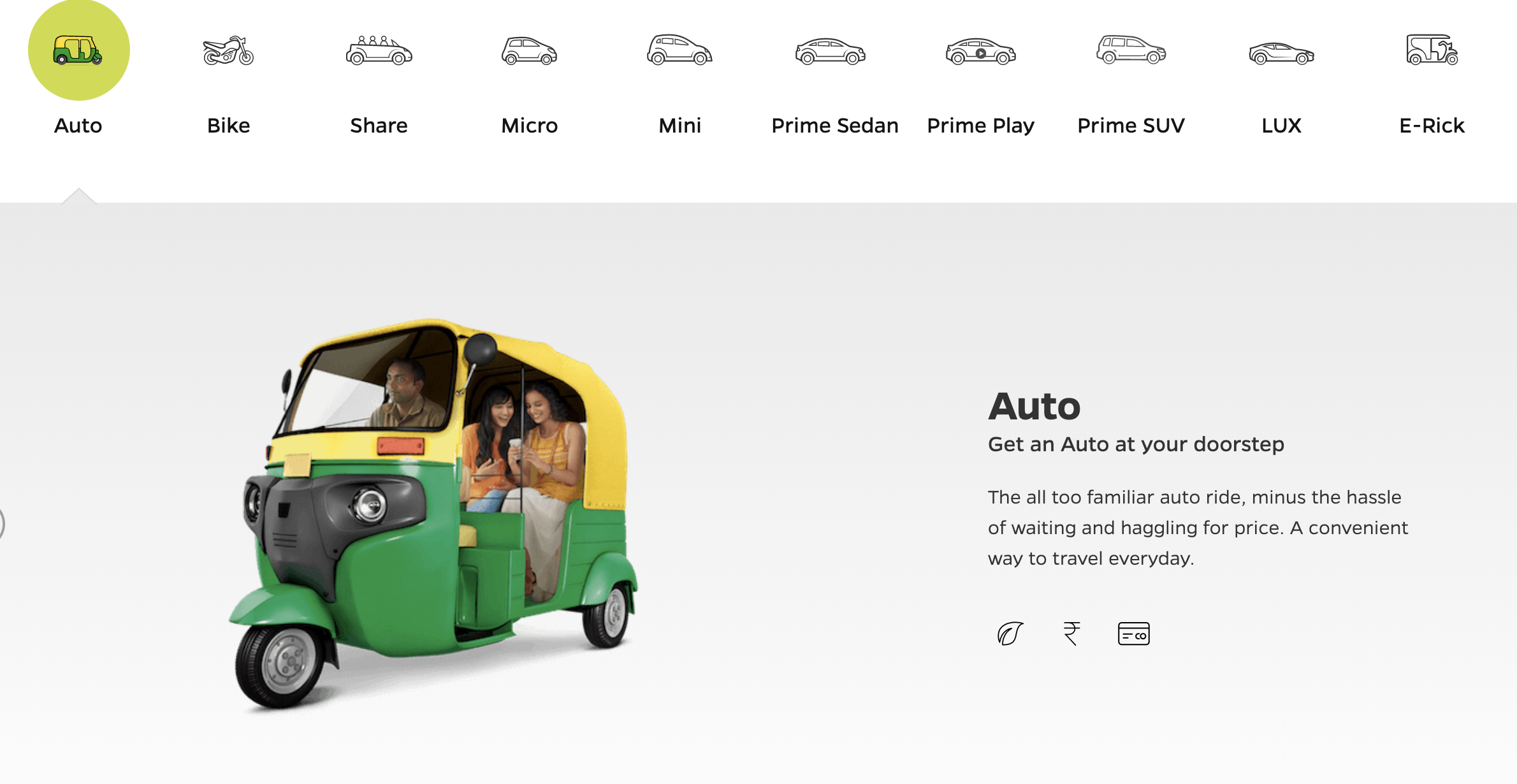 앱을 설치하고 휴대전화 인증까지 마쳤다면 이후 사용법은 우버나 카카오택시 등과 유사합니다. 목적지를 설정하고, 요금과 이용 수단을 확인하고 승인을 누르면 기사가 픽업을 하러 옵니다. 이용 수단으로는 오토릭샤 이외에도 바이크, 미니, 세단 등을 선택할 수 있습니다.
