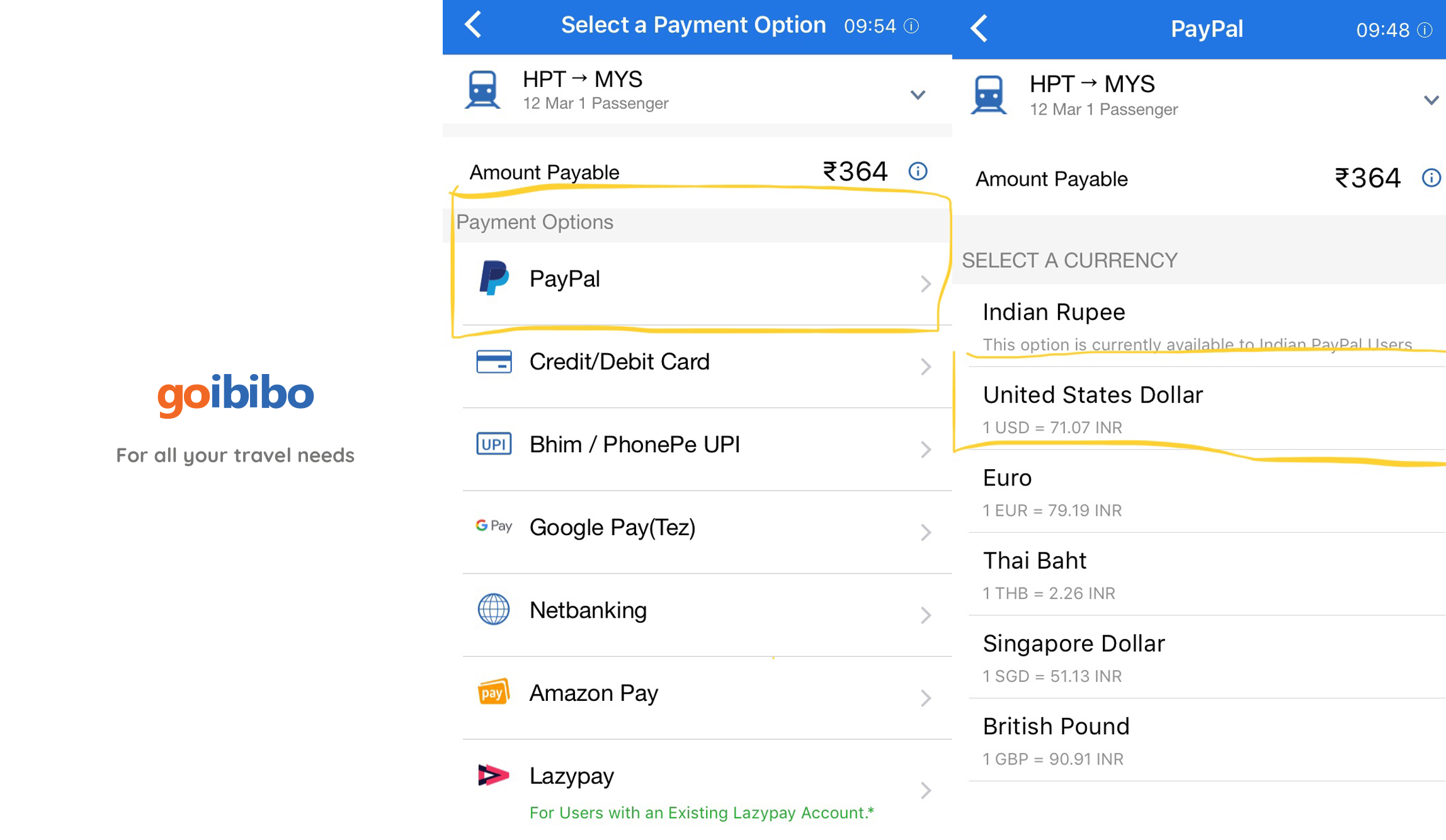 하지만 방법이 있었습니다. 바로, "고이비보(Goibibo)라는 어플에서 페이팔 USD 결제"를 하면 됐습니다! 이를 위해서는 고이비보 어플과 함께 페이팔 아이디와 이에 연동된 카드(한국 카드 무방)가 있어야 합니다.