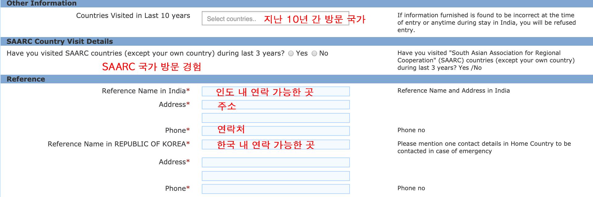 다음으로 지난 10년 간 방문 국가 리스트를 적고, SAARC 국가 방문 경험에 응답합니다. 2019년 12월 기준, SAARC 국가는 아프가니스탄, 방글라데시, 부탄, 인도, 몰디브, 네팔, 파키스탄, 스리랑카입니다. 다음으로 인도 내 연락 가능한 현지인 정보를 입력합니다. 저는 체류 예정 숙소 정보를 입력했습니다.