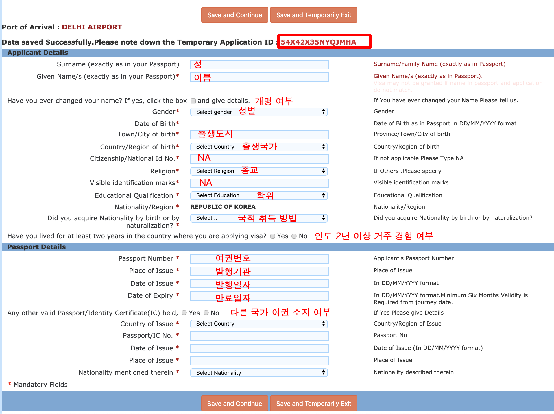 다음 창에서 가장 먼저 할 일은 화면 상단의 임시 신청 ID를 메모하는 것입니다. 다음으로 신청자 정보와 여권 정보를 입력합니다. 이때 신청자 이름은 여권에 나온 것과 정확히 일치해야 합니다.