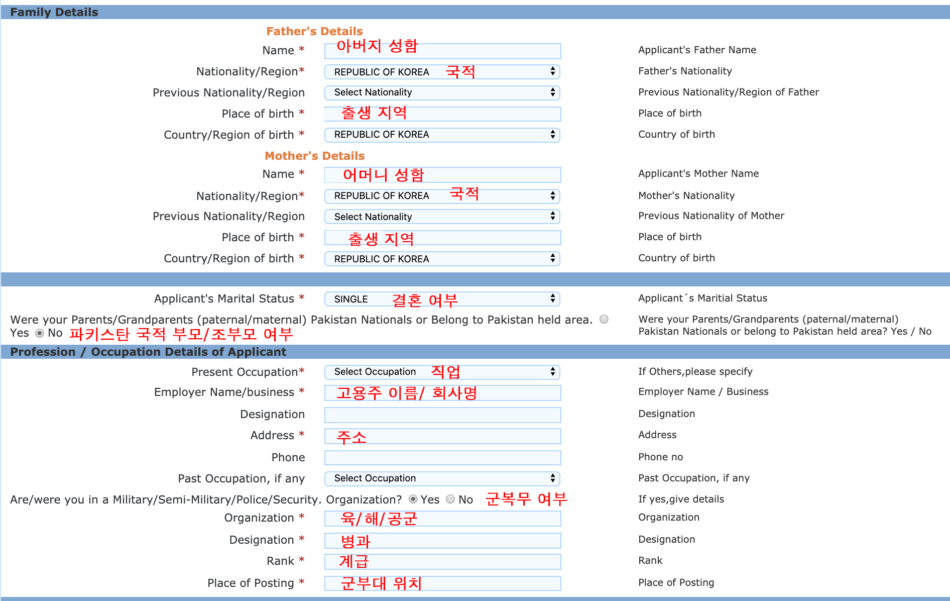 신청자의 현 주소와 본 거주지를 영문으로 입력합니다. 이후 가족 사항과 결혼 여부, 직업을 입력합니다. 군복무 해당 사항이 있을 경우 입력합니다.