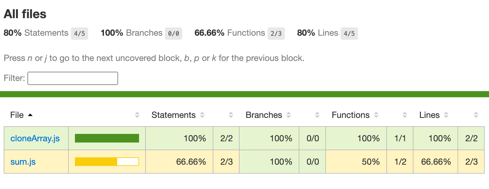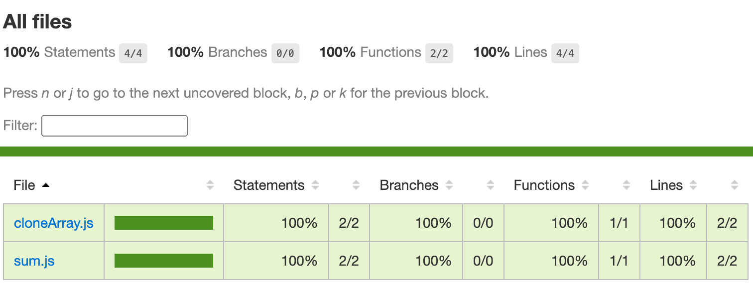 또한 lcov-report 디렉토리 내에 index.html 파일이 생성된 것을 볼 수 있는데요. 해당 파일을 열어보면 다음과 같이 시각화된 테스트 결과를 볼 수 있습니다.