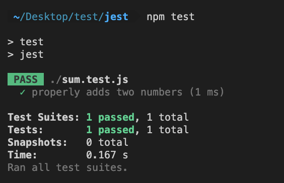 이를 테스트하라면 sum.test.js 파일을 새롭게 생성하고 다음과 같이 sum 함수를 불러온다음, Jest에서 제공하는 test 함수를 사용하여 아래와 같이 코드를 작성합니다.