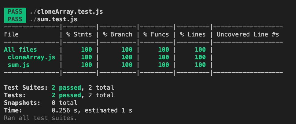 위에서 테스트 코드는 성공 또는 실패의 결과만 출력해줄 뿐 어떤 함수가 어떻게 테스트를 통과했는지는 보여주지 않습니다. 해당 로그를 찍으려면 package.json에서 "test": "jest --coverage"와 같이 수정해줍니다.