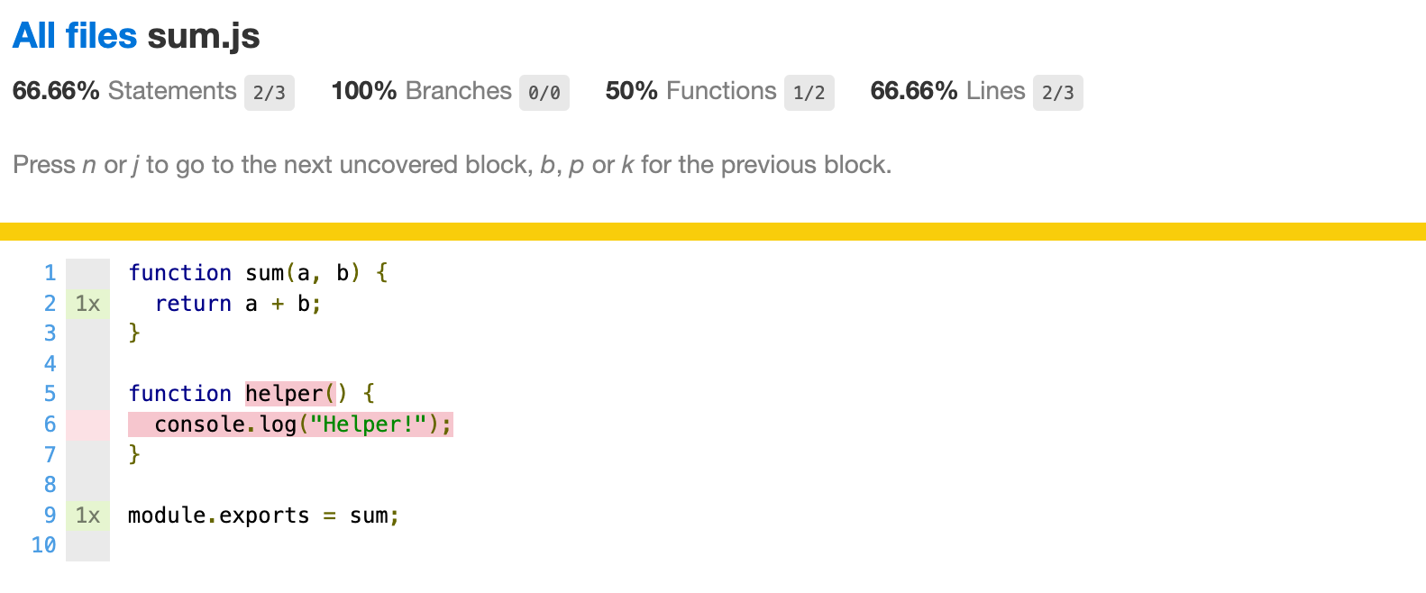 만약, 새로운 함수를 만들고 테스트를 진행하지 않는다면 다음과 같이 표시되며 해당 파일을 이름을 클릭하면 테스트가 진행되지 않은 부분을 확인할 수 있습니다.