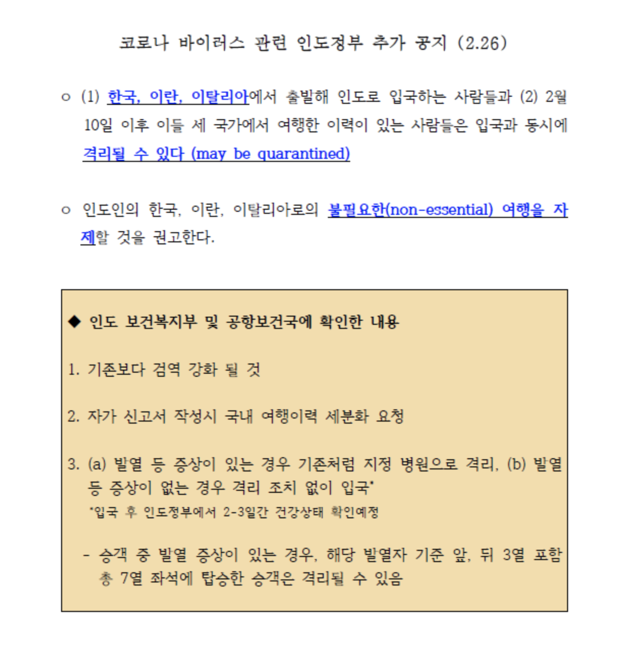 인도 정부는 현재 한국, 이란, 이탈리아를 출발해 입국하거나, 2월 10일 이후 해당 국가를 방문한 이력이 있는 외국인에 대해 검역을 강화하고, 발열 등 증상이 있는 경우 격리 조치를 취할 것이라 밝혔습니다. 또한, 증상이 없다 해도 입국 후 2~3일 간 건강 상태를 확인한다고 밝혔습니다.
