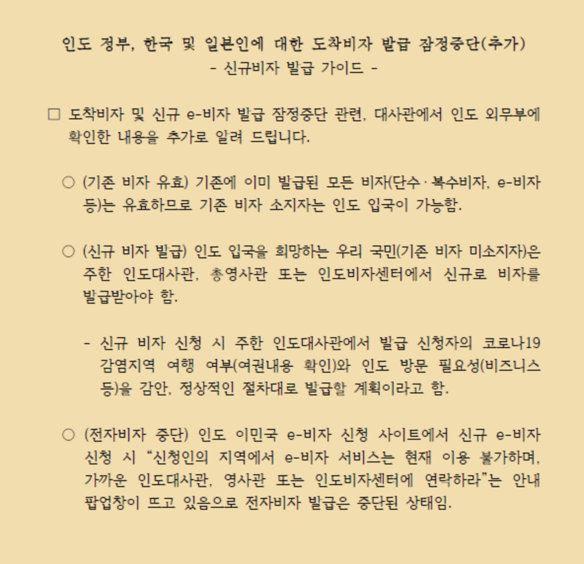 인도 정부는 2020년 2월 27일부로 '한국인과 일본인에 대한 도착비자와 전자(e-비자) 발급을 중지'한다고 밝혔습니다. 한국에서의 신종 코로나 확산 때문인데요. 이에따라 새롭게 비자를 받아 인도에 방문하려는 한국인들은 대사관에서 심사를 거쳐야만 합니다.