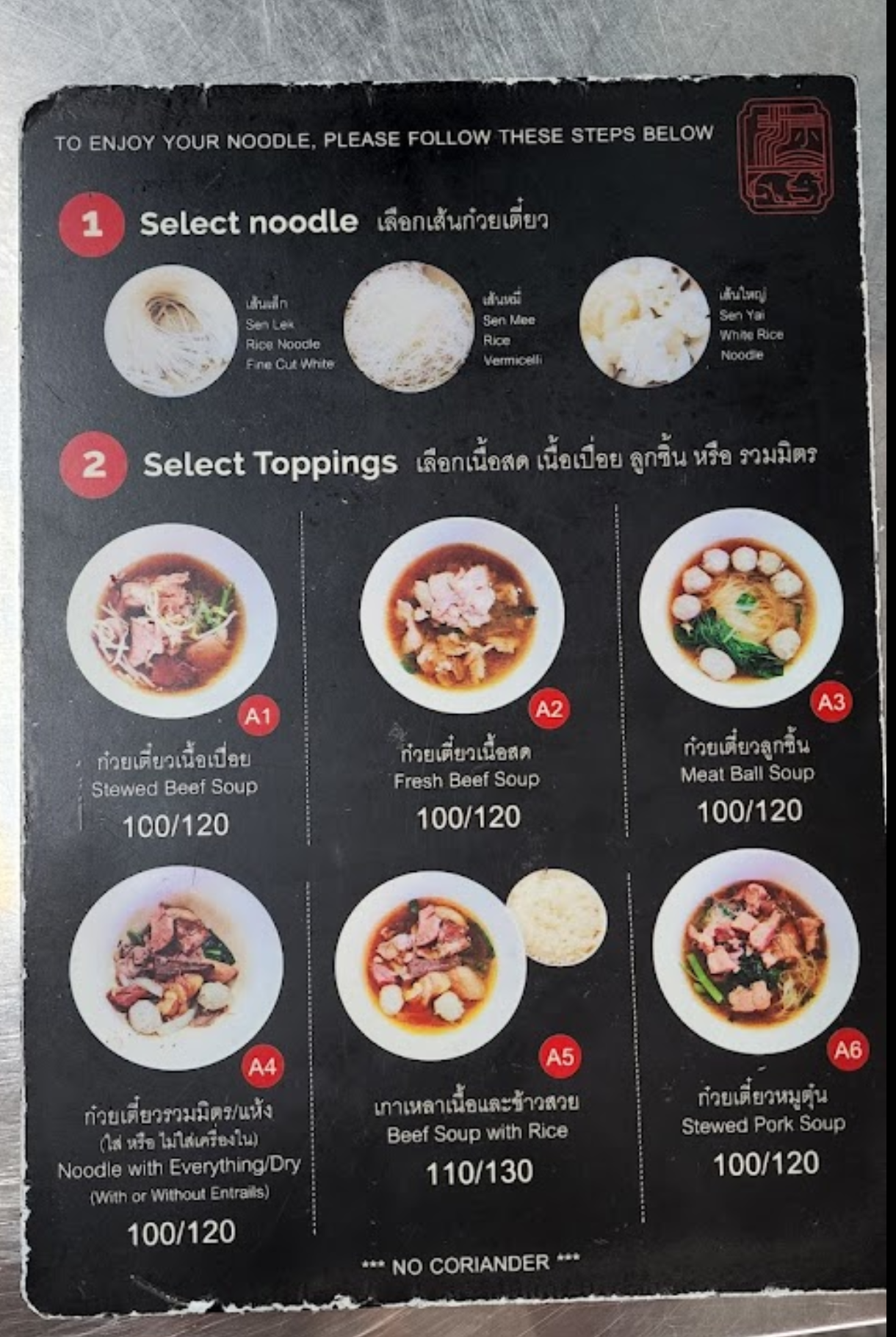 메뉴판은 아래와 같고요. 면을 먼저 고르고 아래에서 토핑을 고르시면 됩니다. 무난하게 A1이나 A2를 시켜주시면 됩니다. 가격은 평균 120바트인데요. 현재 환율로 하면 5천원 가량됩니다.