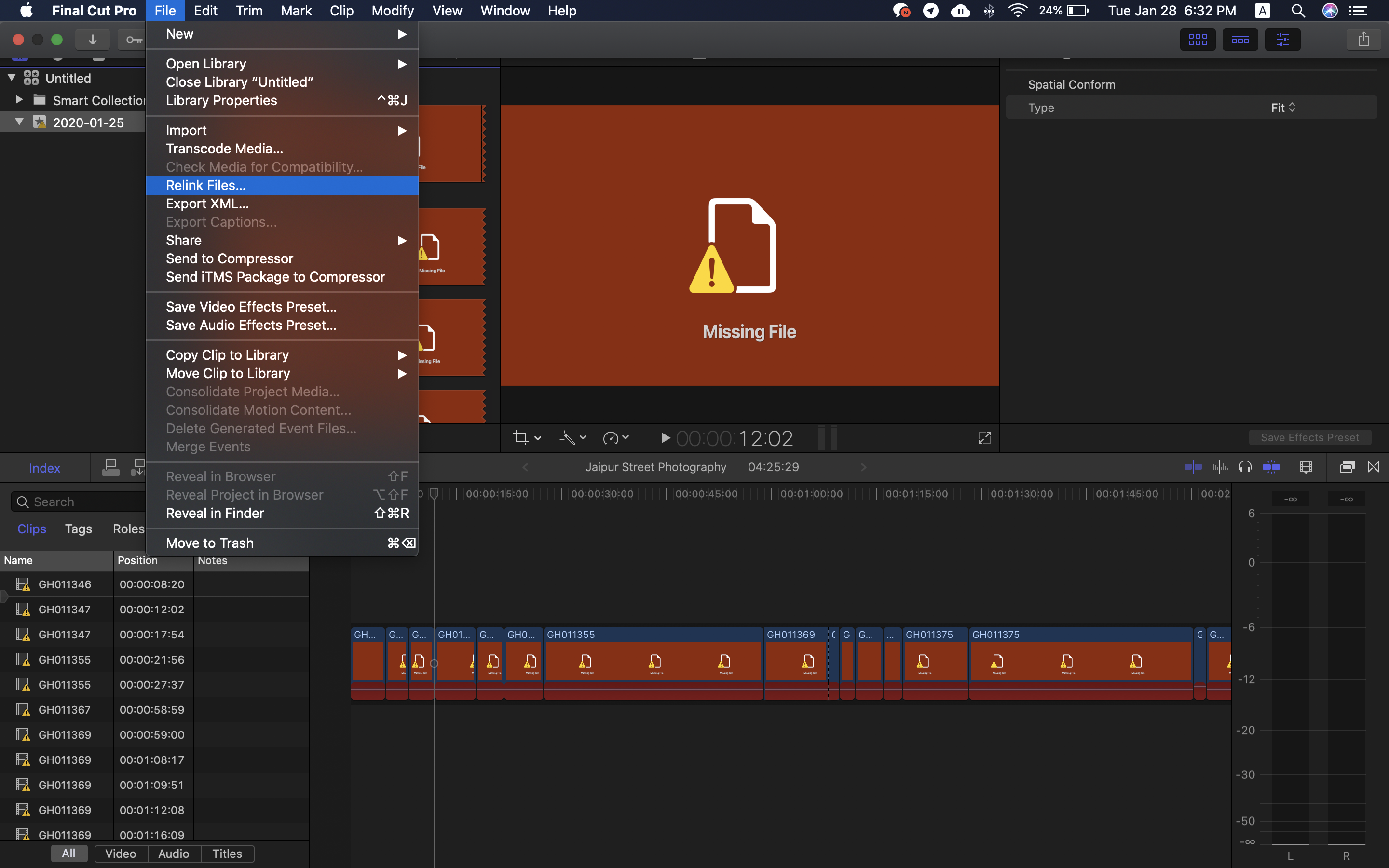 파이널컷으로 편집을 하다가 파일을 이동하면 아래처럼 파일 경로를 찾을 수 없다는 느낌표 오류가 뜨게 된다. 간단히 파일 위치를 재연결해주면 해결할 수 있는 것이지만, 해당 액션 경로를 찾기가 가끔 헷갈려 기록해 둔다.