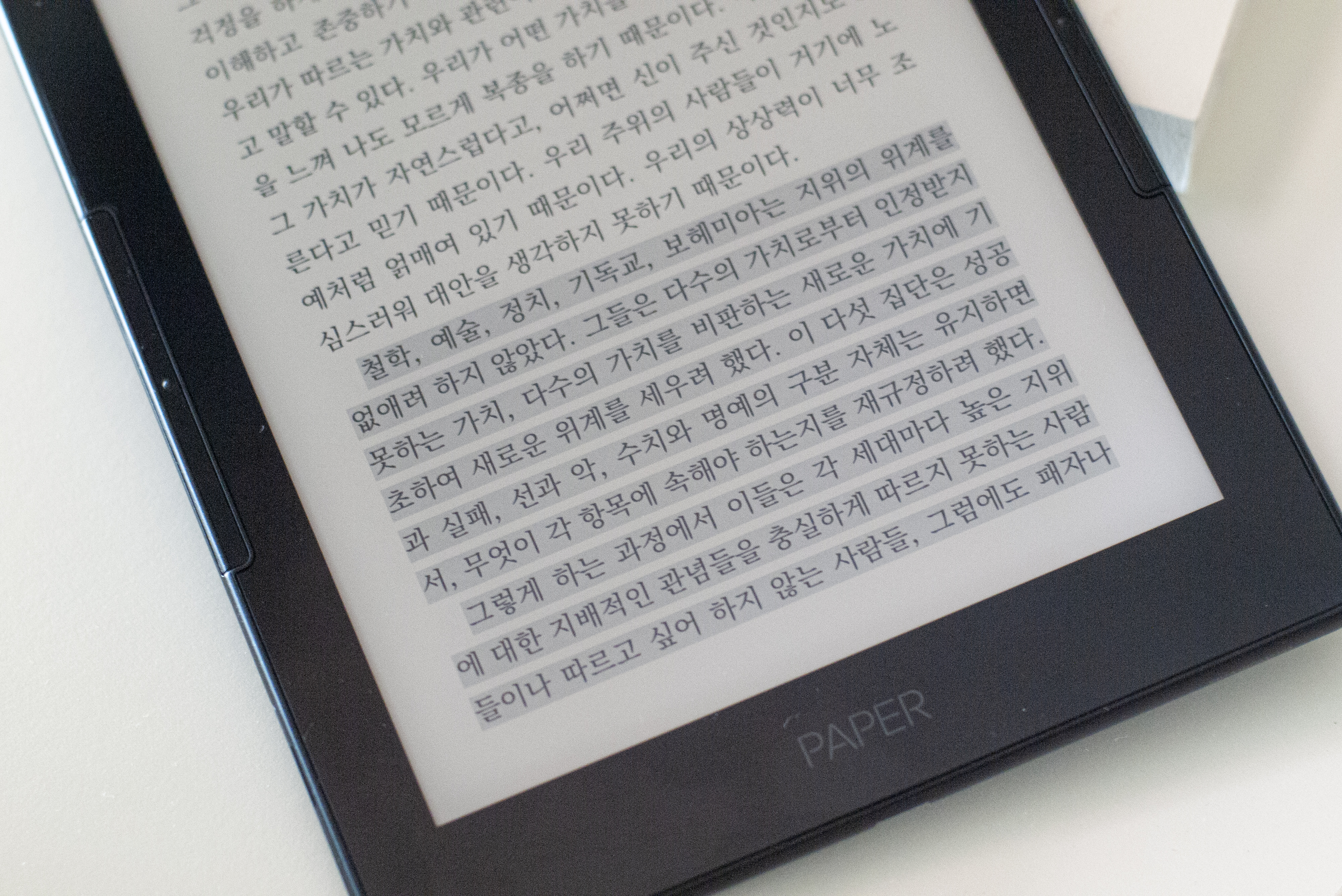 종이책 수준의 300dpi 해상도. 달그락 거리는 좌우측 페이지 이동 버튼. 화면에 표시된 책은 알랭 드 보통 <불안>의 일부.