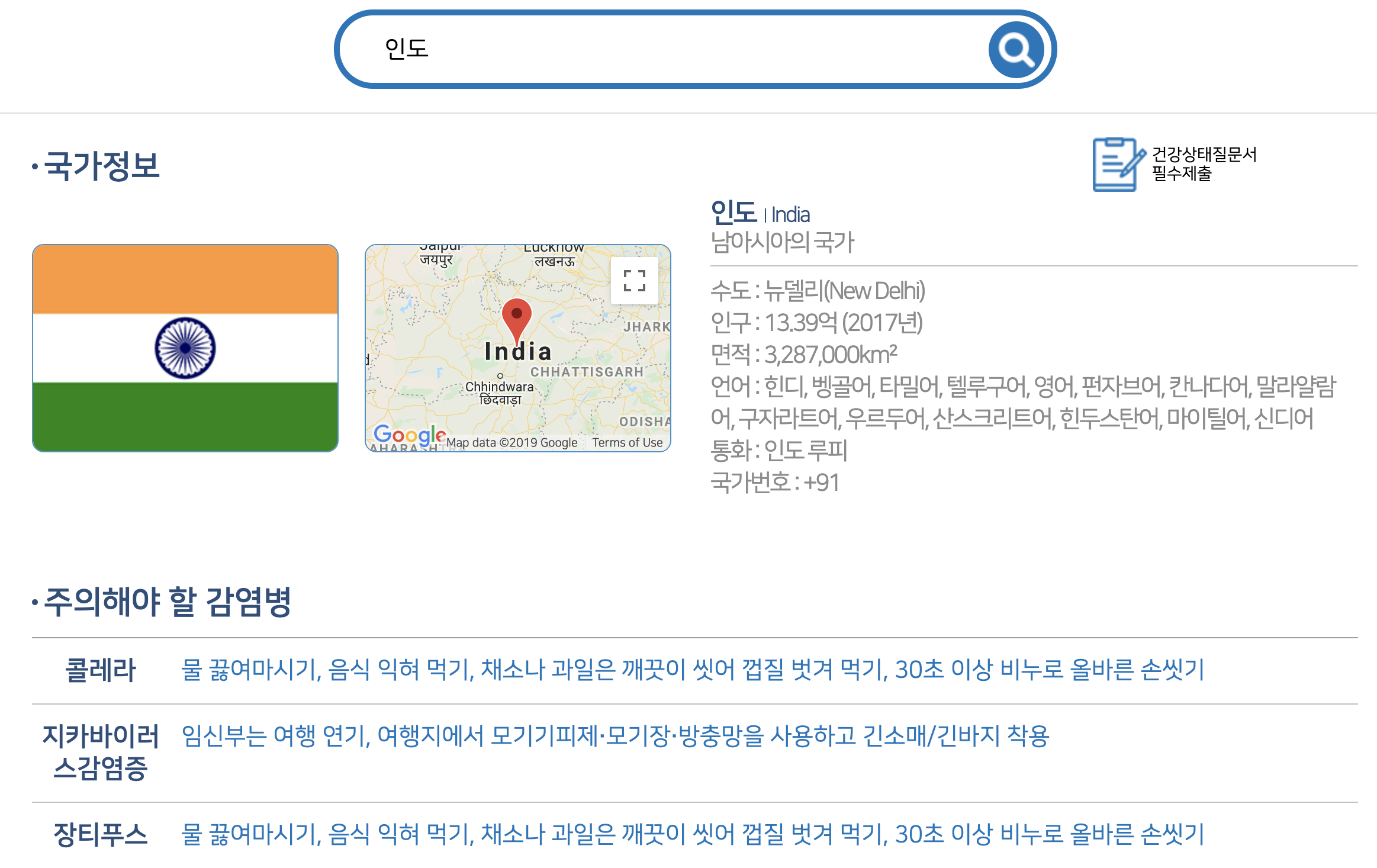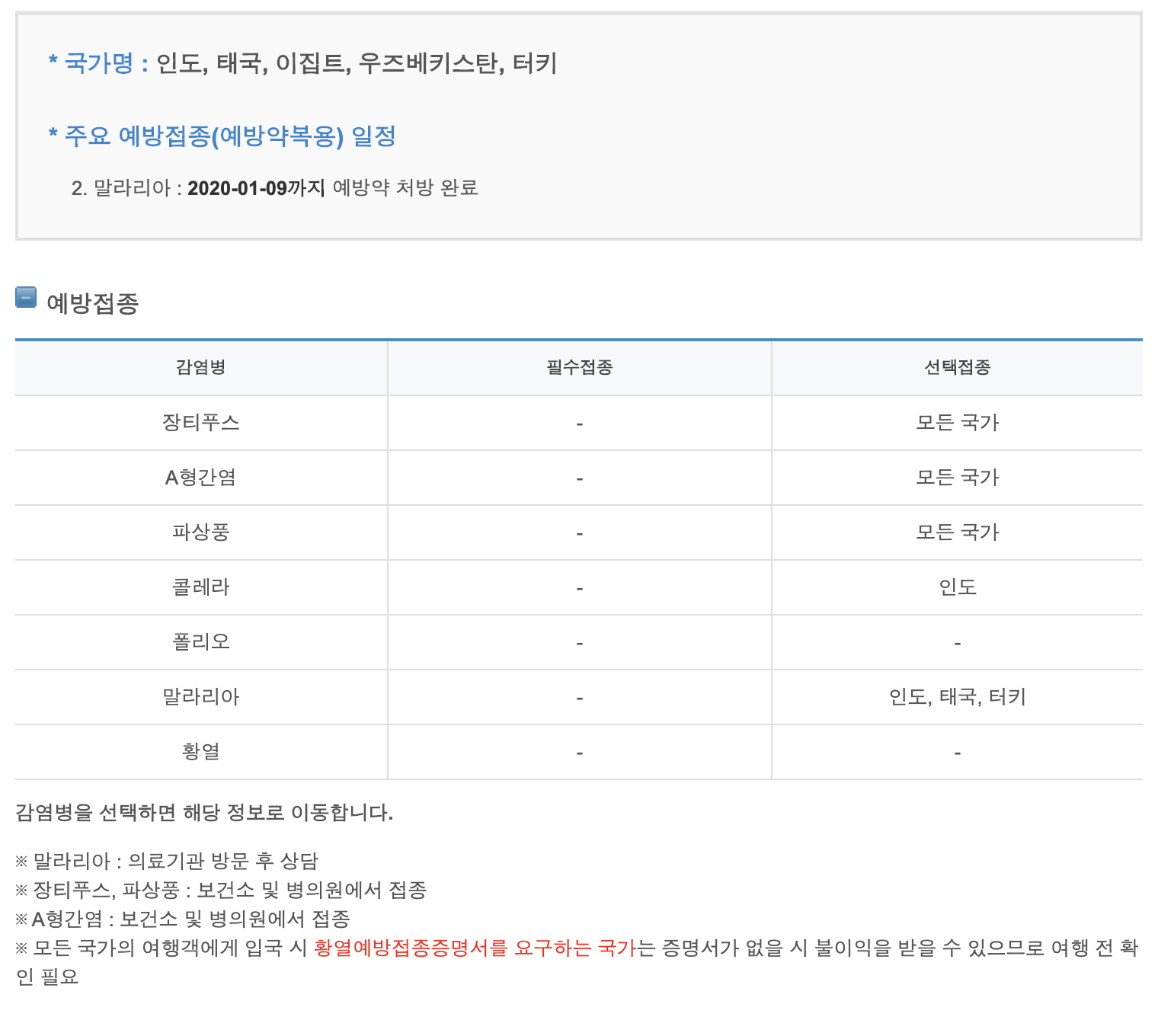 질병관리본부 국립검역소 웹사이트에 들어가면 해당 국가 여행시 필요한 예방접종 사항과 일정을 조회할 수 있습니다. 여행하려는 국가와 시기를 설정하고 검색하면 다음과 같은 안내 사항을 볼 수 있는데요. 약 한 달 뒤에 인도, 동남아, 중앙아 근방을 여행하겠다고 하고 조회해보니, 장티푸스, A형간염, 콜레라, 말라리아 등의 예방 접종을 맞아야 한다는 안내를 받았습니다.