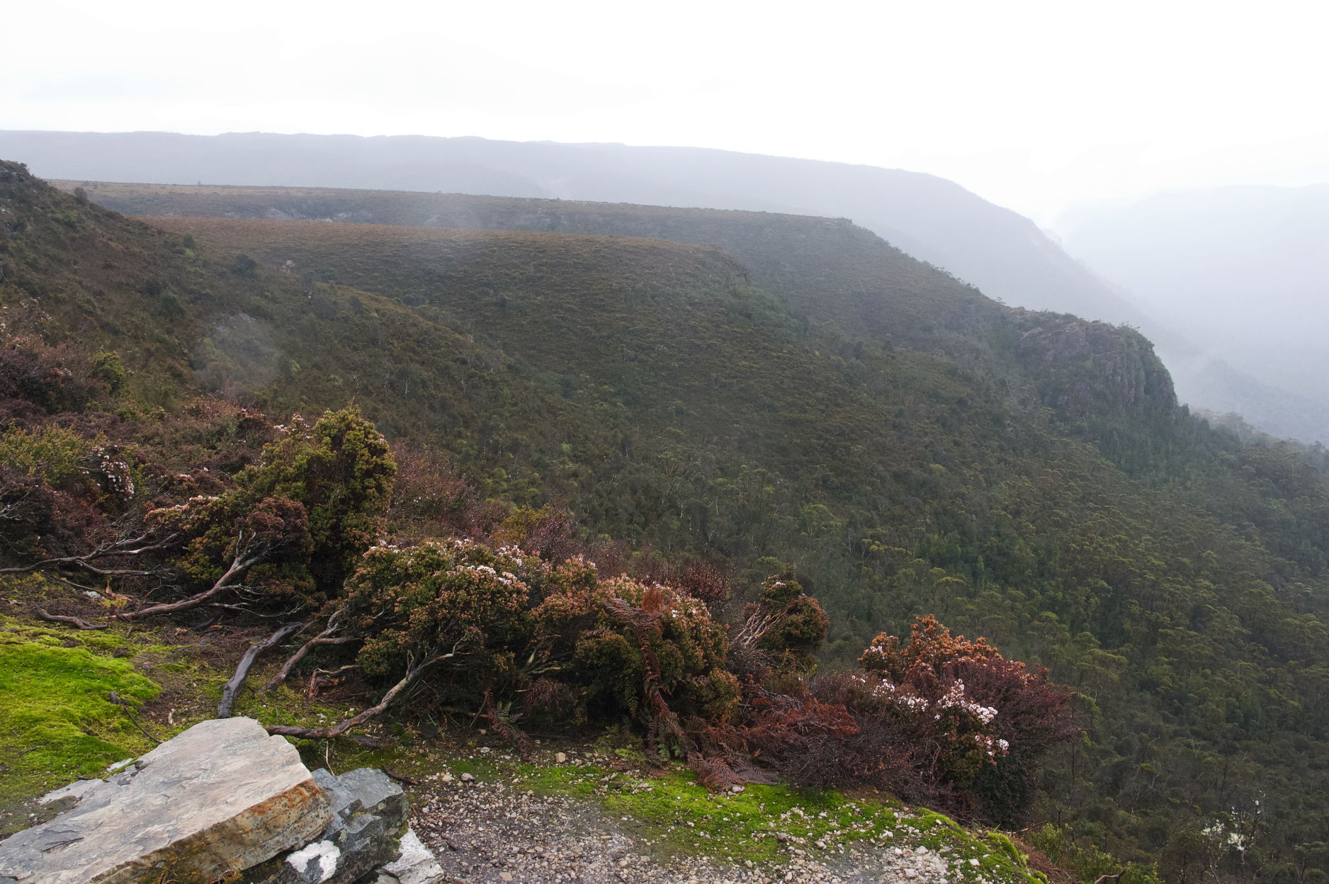 아침으로 오트밀과 무즐리를 먹었다. 커피 한 잔을 마시고 윈더미어 헛(Windermere Hut)으로 떠날 준비를 했다. 간밤에 널어둔 빨래는 축축했다. 식량은 조금씩 줄었지만, 배낭은 어깨와 허리를 여전히 짓눌렀다. 비가 타닥거리는 소리를 내며 땅 위에서 튀어 오르고 있었다. 우리는 판초를 뒤집어 쓰고 헛을 나섰다.