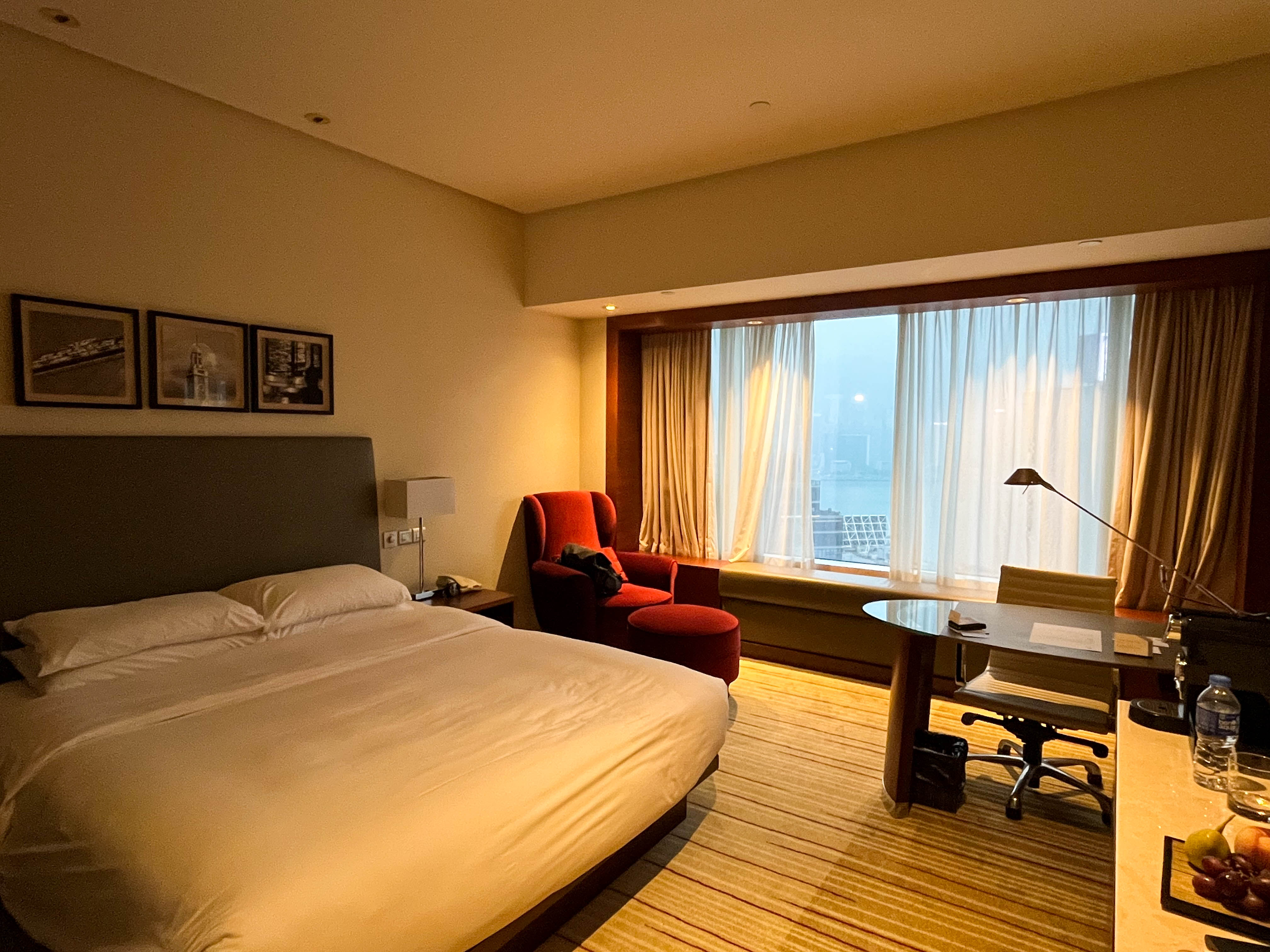 저는 하얏트 리젠시의 클럽 하버뷰 (킹베브) 룸에 머물렀어요. 1박당 가격은 45만 원 선이었습니다. 처음 도착해서 마주한 객실 내 풍경이 꽤나 아늑했습니다. 마침 바깥 날씨도 흐리고 해 질 무렵이어서인지 더 아늑하게 느껴졌던 것도 같아요.