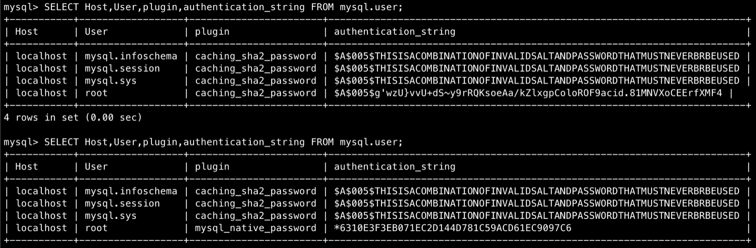 SELECT Host,User,plugin,authentication_string FROM mysql.user;