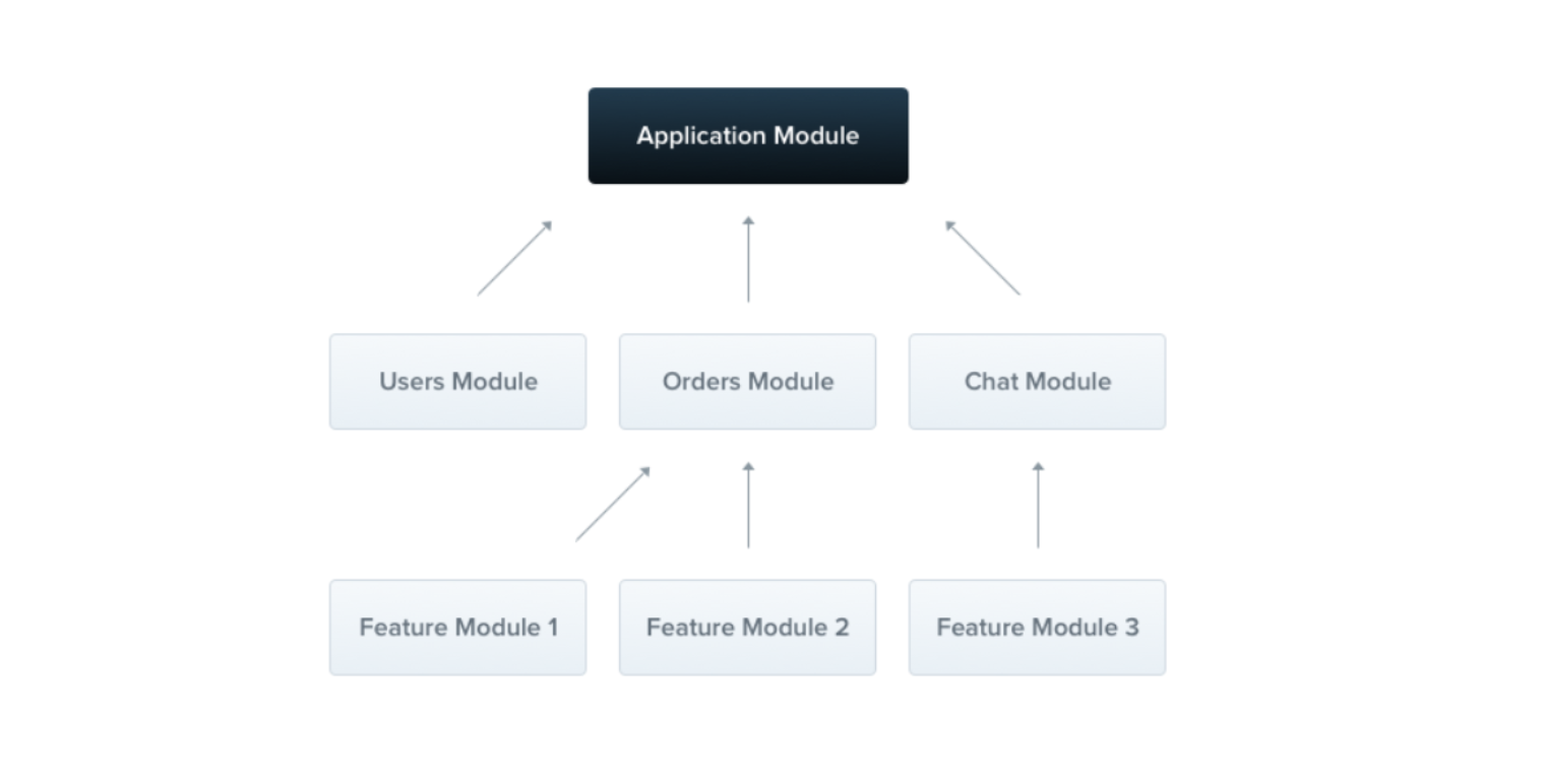 모듈은 보통 기능 모듈을 제외하고 공통 기능을 모아놓은 CommonModule, 공통 기능이지만 앱을 구동하는 데 필요한 기능(로깅, 인터셉터)을 모아놓은 CoreModule로 구성됩니다. AppModule에서 앱을 구동할 때는 두 가지 모듈을 모두 가져오는 것이 아니라, CommonModule을 CoreModule로 가져온 다음(imports), CoreModule에서 CommonModule을 내보내고(exports), AppModule은 CoreModule을 가져옵니다. 이렇게 하면 AppModule에서 CommonModule을 직접 불러오지 않았음에도 불구하고 CommonModule의 프로바이더를 사용할 수 있습니다.