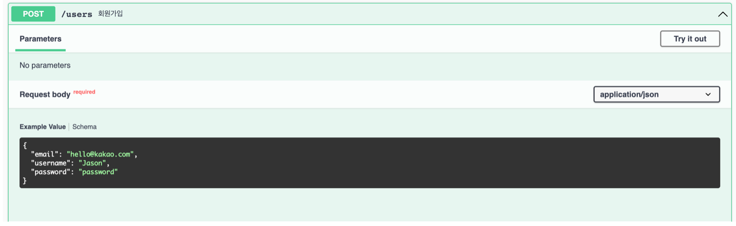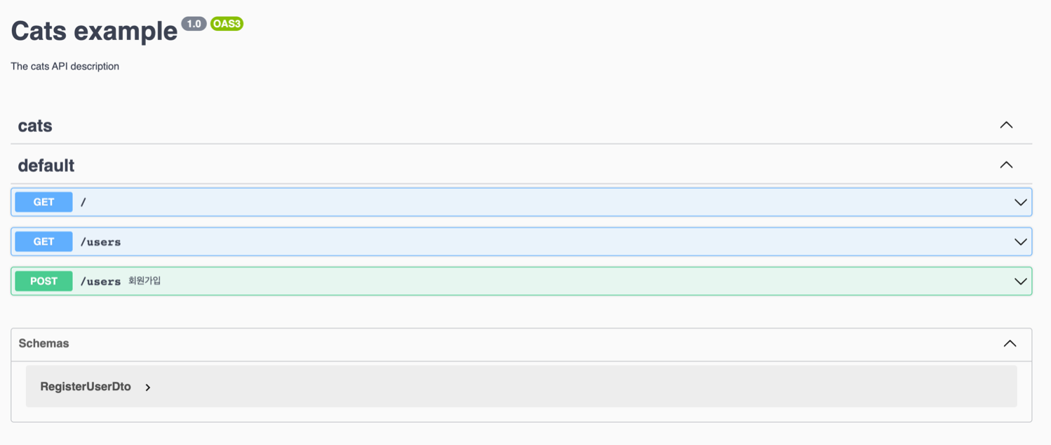 저장 후 다시 API 문서 페이지로 이동하면 회원가입이라는 설명이 추가된 것을 볼 수 있습니다.