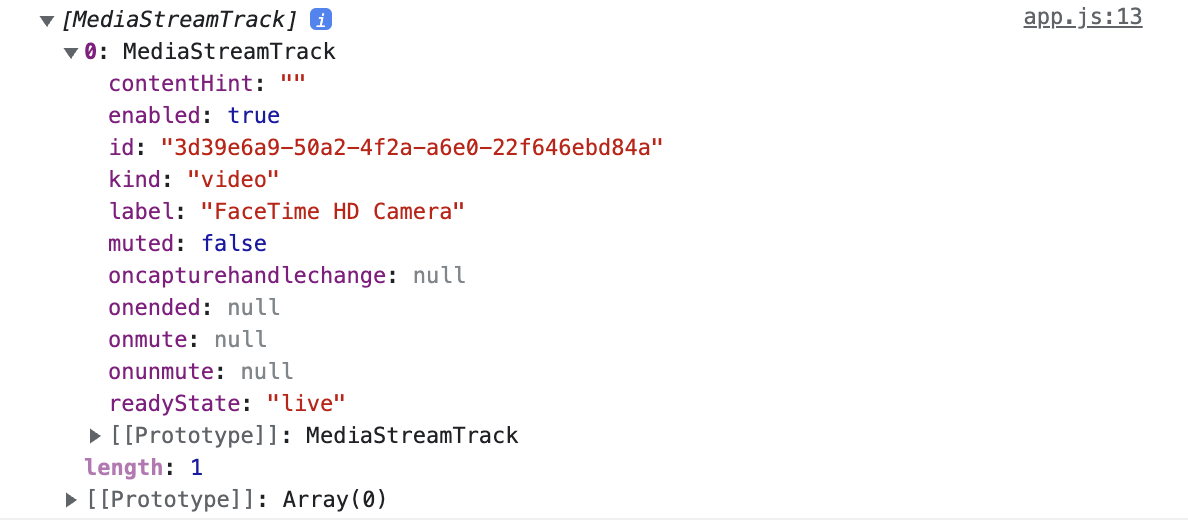 getVideoTracks()과 getAudioTracks()를 통해 아래와 같이 영상 및 음성 기기의 상태를 볼 수 있습니다.
