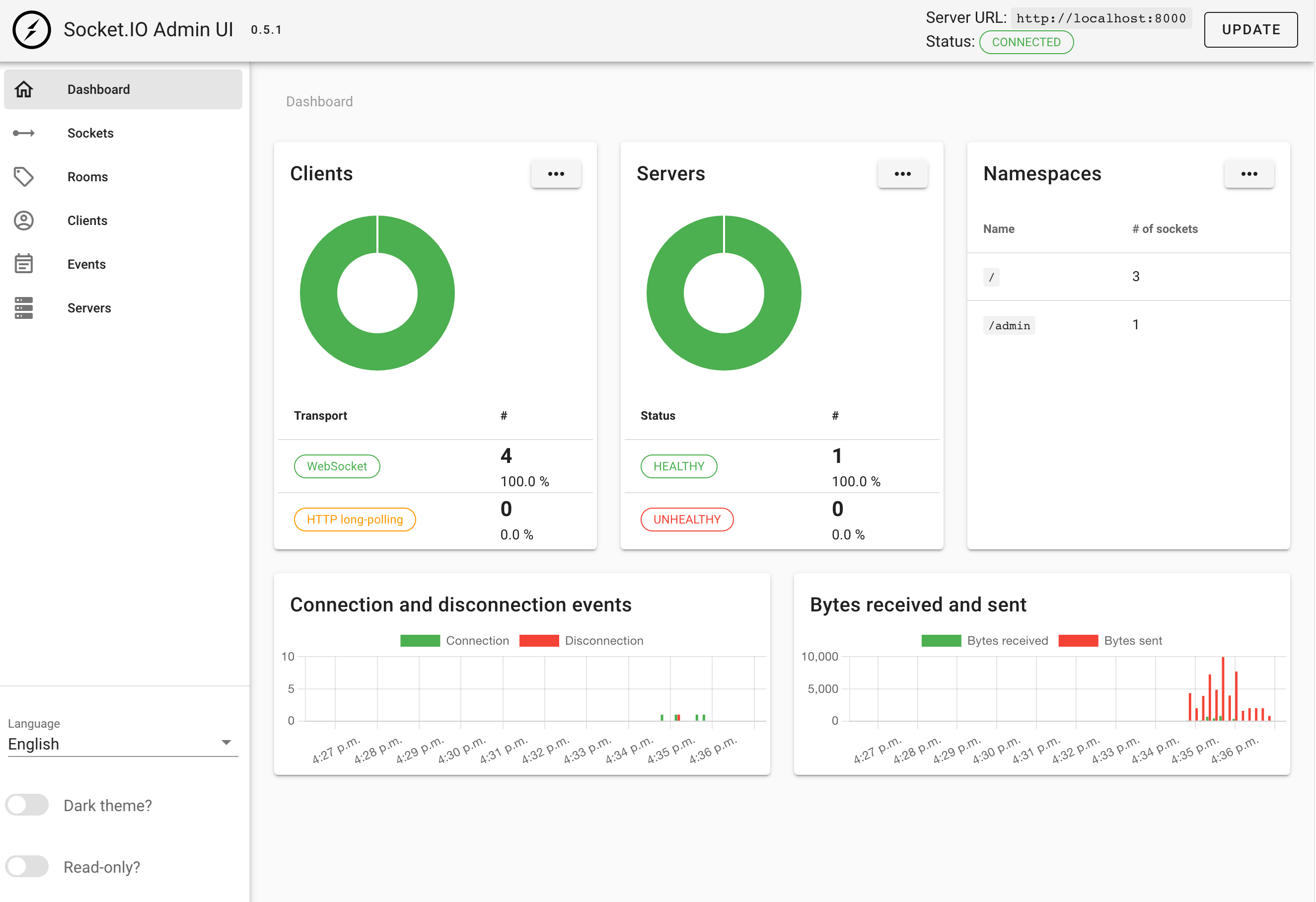 이제 아래와 같이 패널에 통신 상태에 대한 통계가 표시되는 것을 확인할 수 있습니다! 아래의 언어 설정을 변경하면 한국어로도 관리자 페이지를 이용할 수 있습니다.